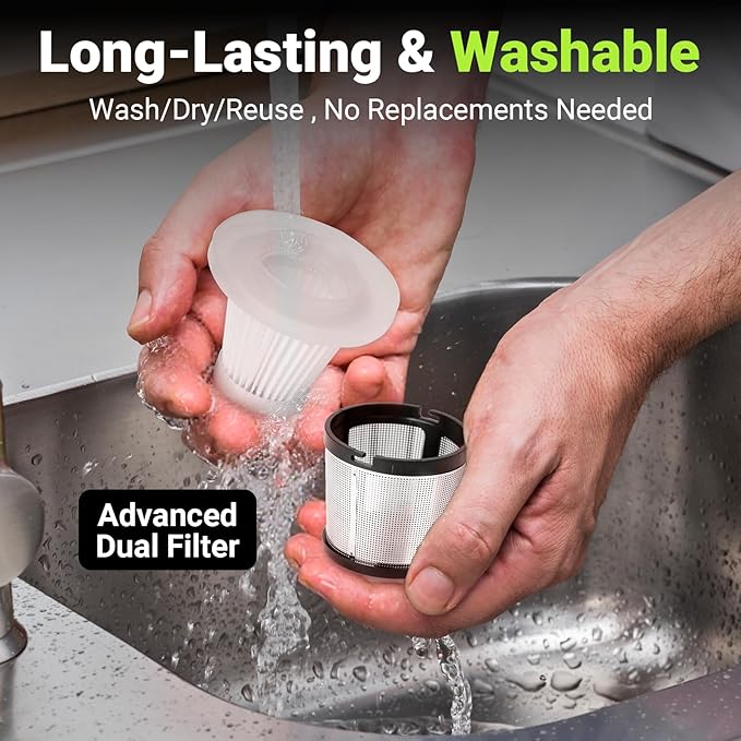 - 【Easy to Maintain with Washable Filter & Multiple Nozzle Design】:Comes with two reusable HEPA filter,one Metal filter and multiple detachable nozzles,Double filtering effect for various tasks. All accessories snap on easily for hassle-free setup and storage