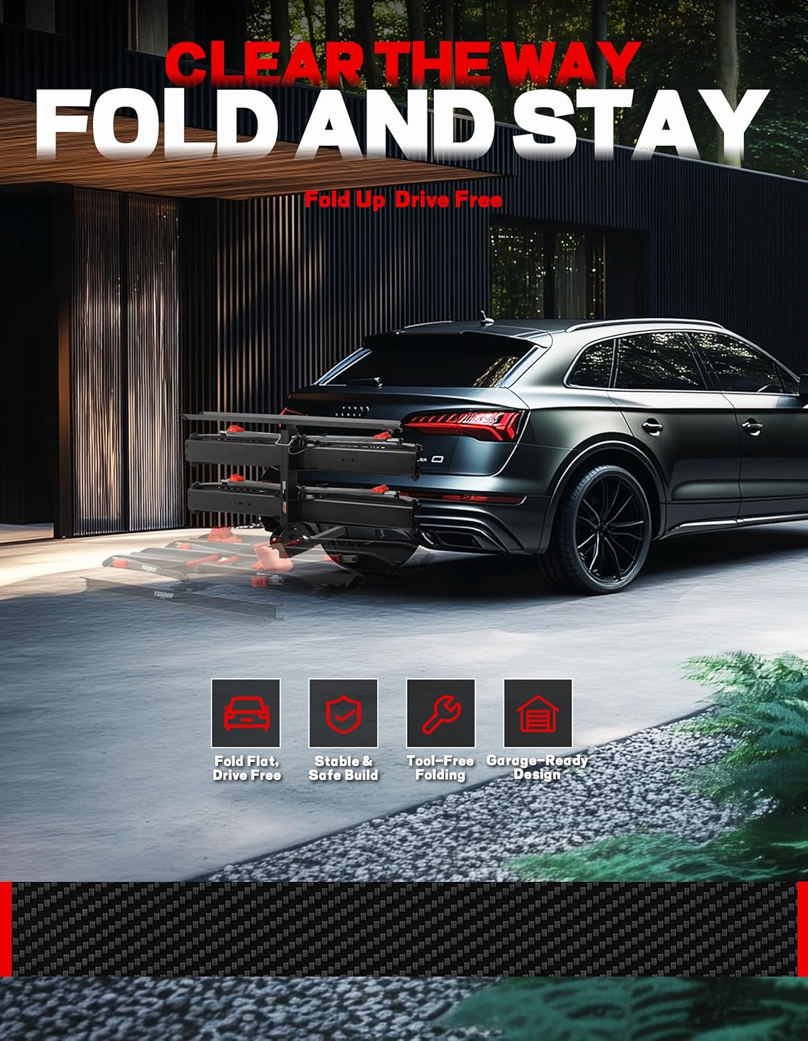 - ăUser-Friendly Featuresă Includes integrated loading ramp for easy bike mounting (supports heavy e-bikes) and 90° foldable design that clears your trunk space. Optional brake light compatibility (sold separately) enhances night visibility. Quick-install hitch system gets you road-ready in minutes.