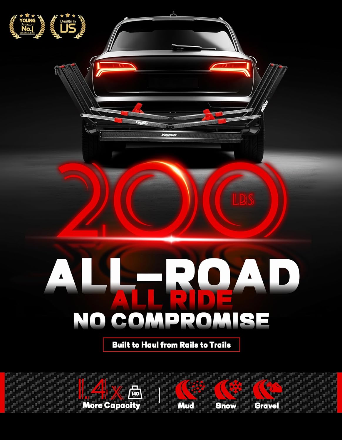- ăAll-Road Heavy-Duty Performanceă Engineered for both rugged trails and city streets with 200lbs capacity (industry-leading for e-bikes). Our reinforced steel-aluminum construction handles intense off-road conditions while maintaining sleek urban aesthetics. Tested stable at 70mph highway speeds.