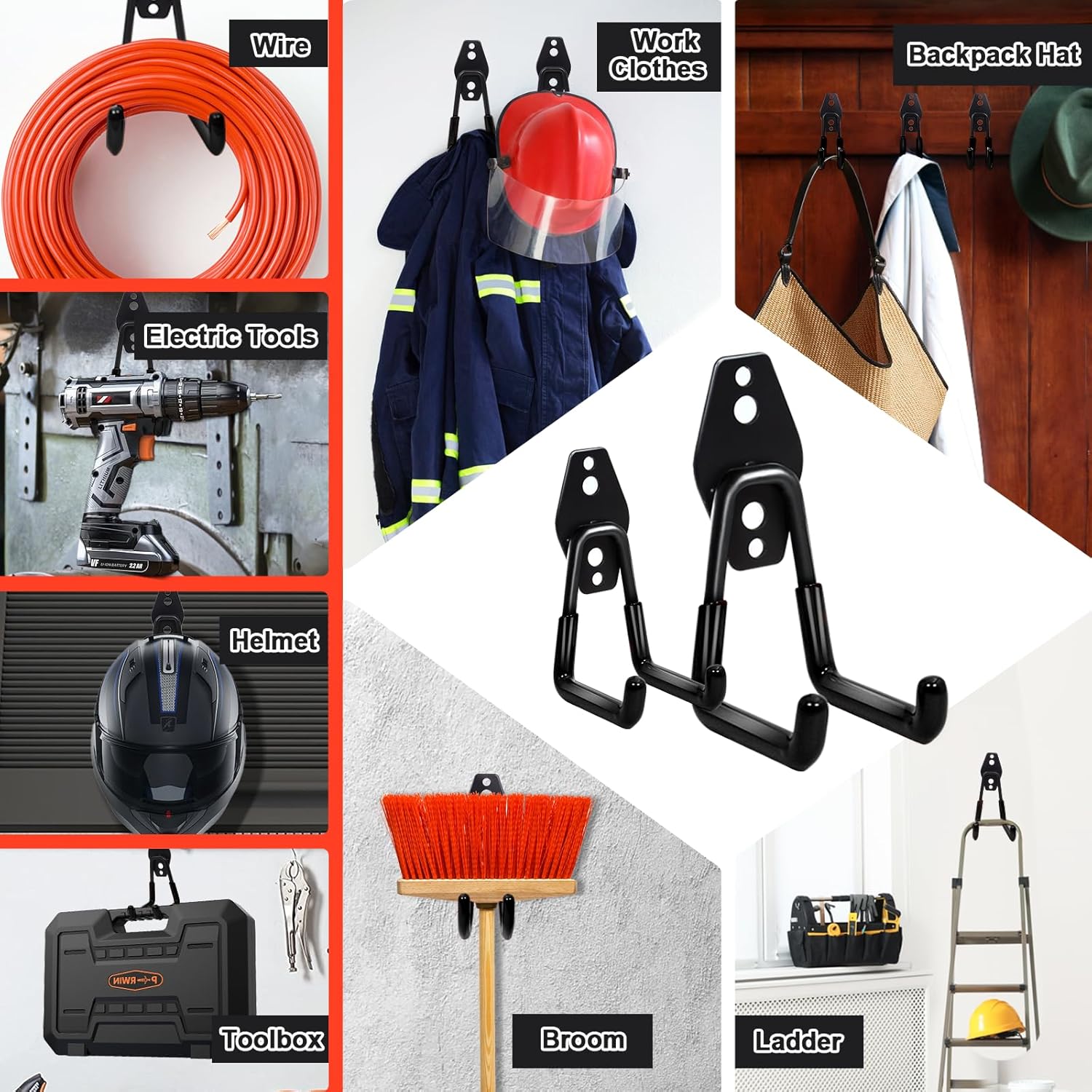 - ✿【 15 Pcs garage hook set】: The Package includes 12 wall mounted hooks with 5 Sizes and 3 extension cord organizer for hanging tools of different sizes and weight. Use for hanging tools and accessories in your home, garage, shed, basement, shed or workshop.