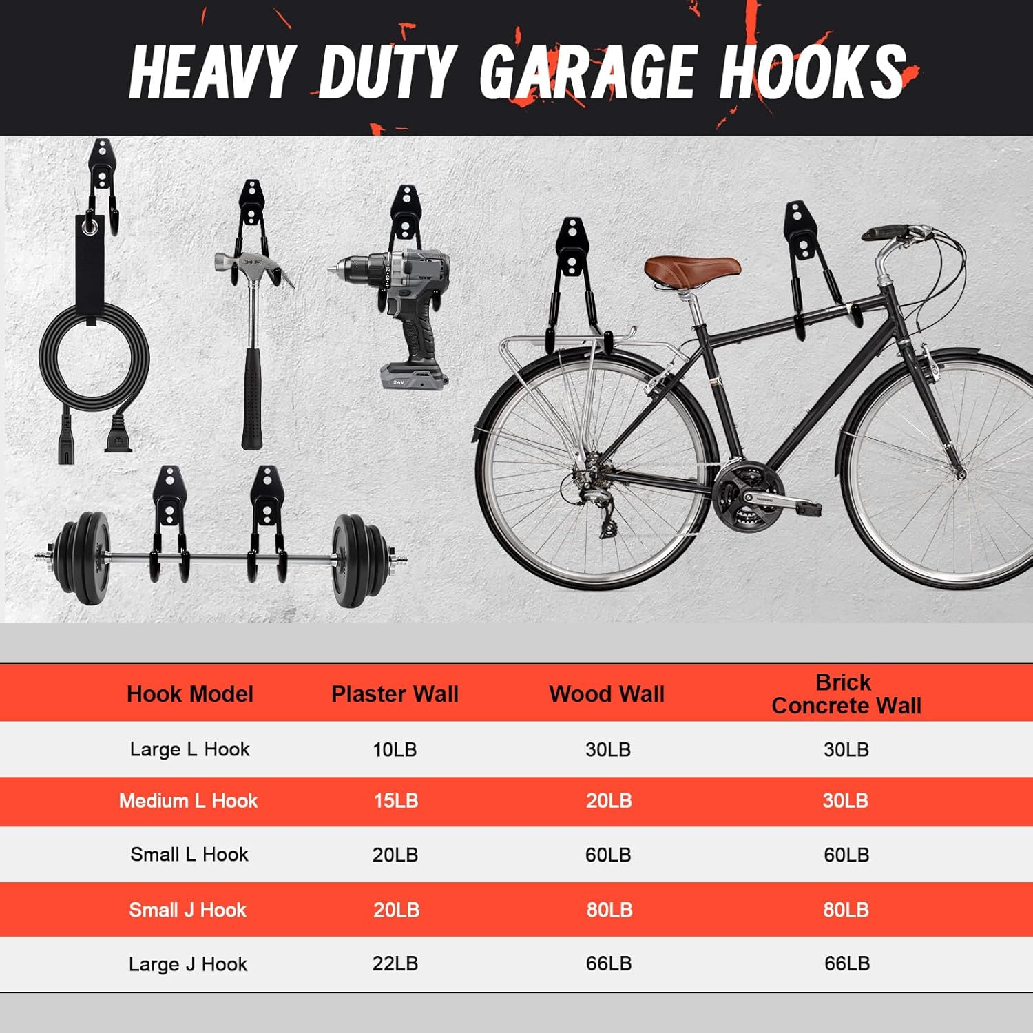 - ✿【Wall Mount Hooks】:The garage organizers and storage hook set comes with screws and anchors, simply with a drill and screwdriver, the heavy duty storage hooks can be easily installed on plaster walls, wooden, concrete, brick walls.