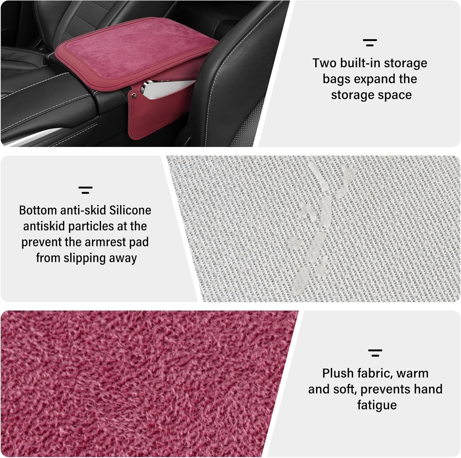 SINGARO Car Leather Center Console Cover with 2 Storage Bags, Universal Furry Fluffy Car Armrest Seat Box Pad, Comfortable Car Interior Accessories, Fits for Most Vehicles (Red)