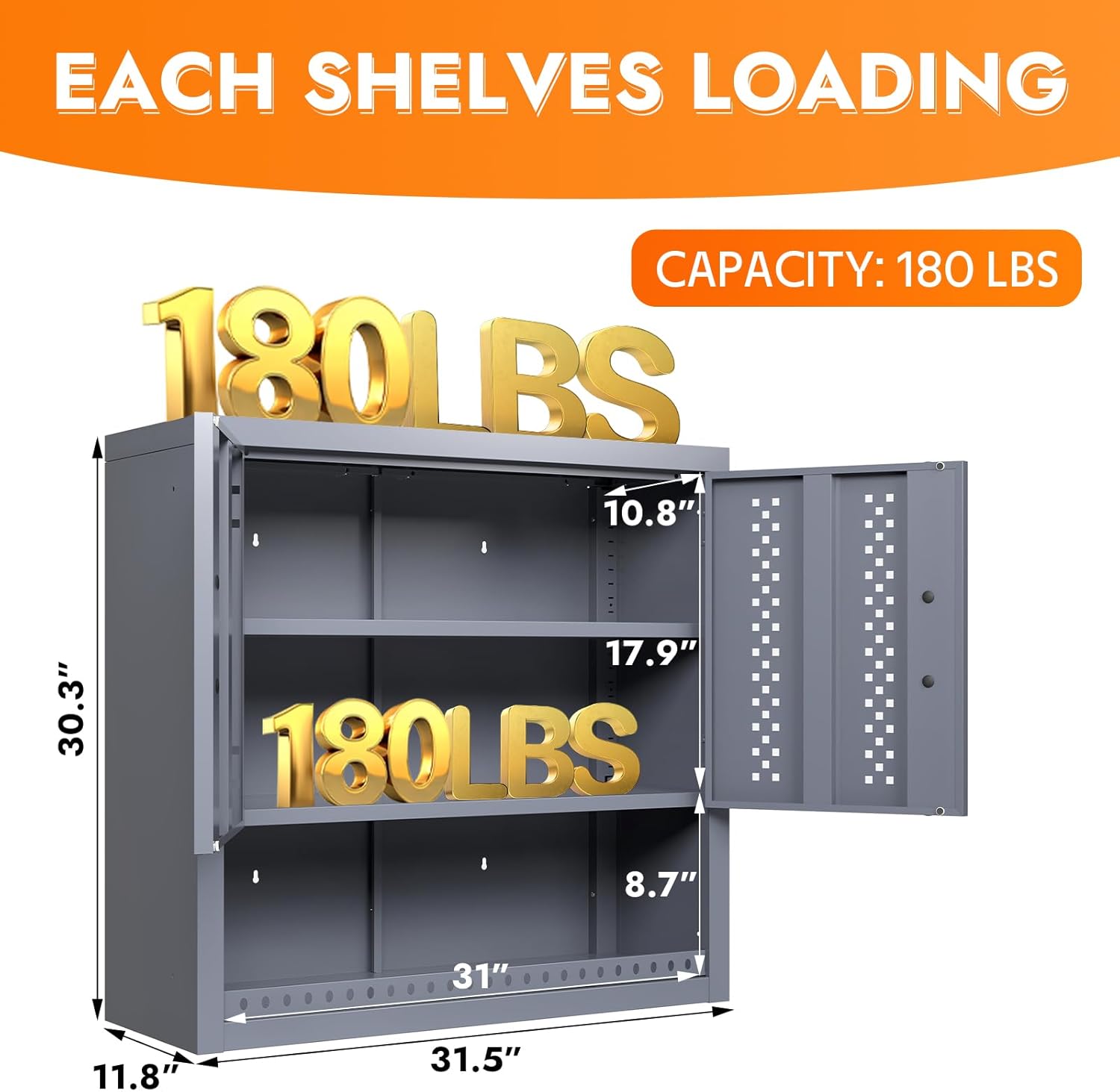 - ăPREMIUM QUALITY MATERIALă Our metal storage cabinet is made of sturdy cold rolled steel, the wall cabinet with 180 lbs load capacity on each shelf. The storage cabinet with powder-coated surface that work against scratches and corrosion, easy to clean and wipe the dirty stain.