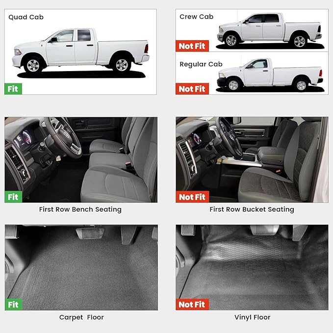 - LASFIT LINERS - Compatible for Dodge Ram 1500 2013-2018 & 1500 Classic 2019-2024 Quad Cab Bench Seat Carpet Flooring. Not for Bucket Seating & Vinyl Flooring. Not for Crew Cab or Regular Cab.
