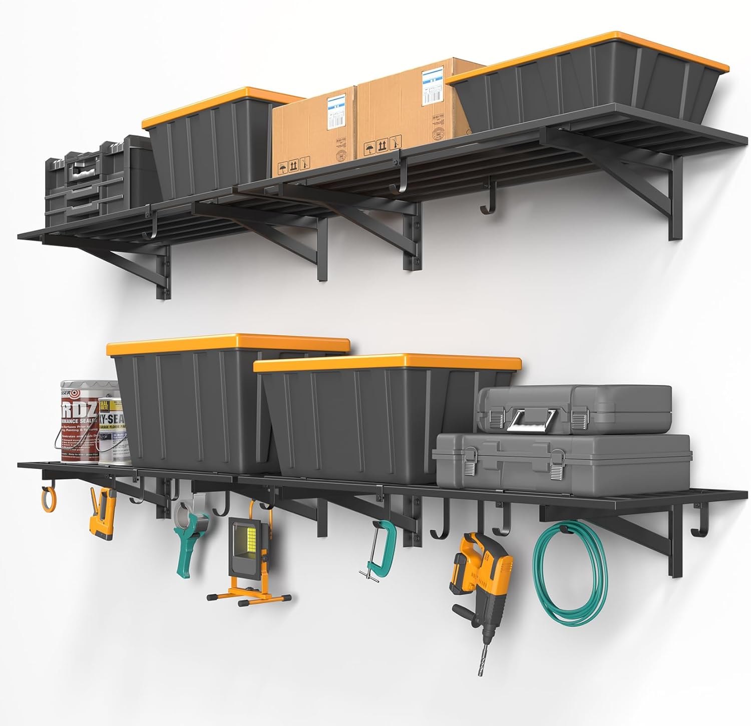 - VERSATILE STORAGE HOOKS: Designed with 4 large and 12 small hooks, this shelving system provides flexible hanging space below the shelves. Perfect for organizing garden tools, sports gear, extension cords, toolboxes, cleaning supplies, bikes, and seasonal decorations with ease