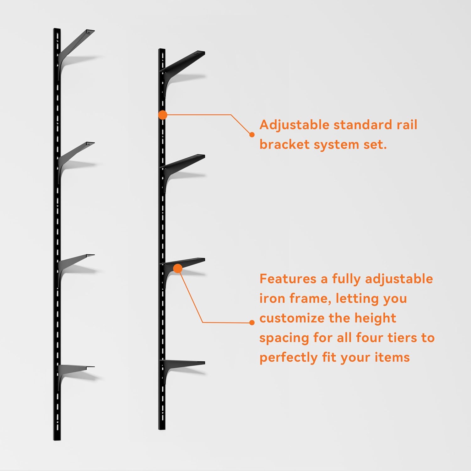 - ăAdjust Different HightăYou will get 3 pieces of shelf rails for this garage shelves and 18 pieces of double track brackets, you can adjust the different hight according your wall's space.Enough to keep you covered for big or small renovation needs, fit tall items like ladders or short bins with zero limitations.