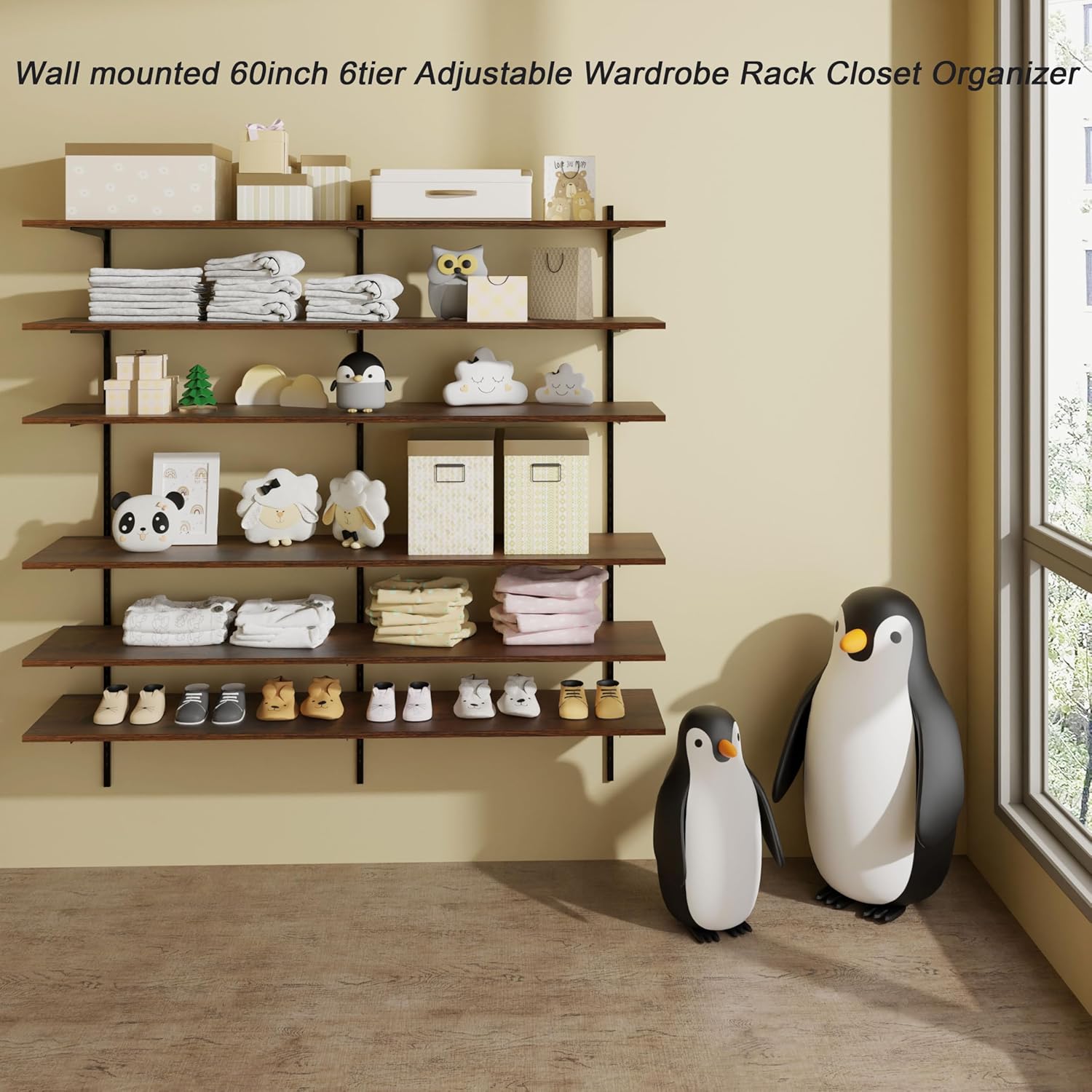 ROGMARS 60" W Garage Wall Mounted Shelving Heavy Duty, 6 Tier Garage Shelves, Adjustable Height Storage Shelving Unit, Wall Shelf Storage Rack Floating Shelves for Warehouse, Pantry, School, Shop