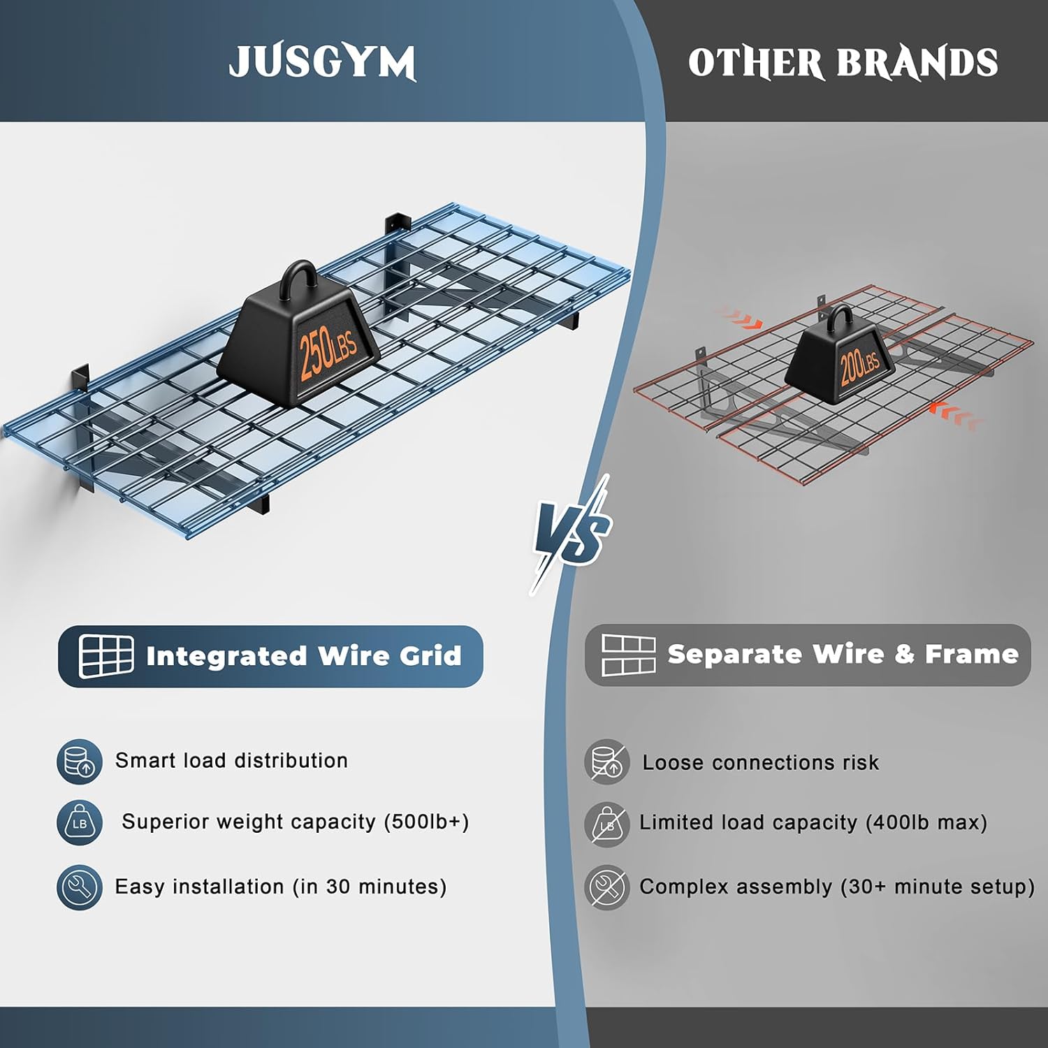 - đăHeavy-Duty Load Capacityă- Jusgym garage shelving wall mounted system is engineered with premium steel, offering exceptional strength. Each 1.5x4ft bracket holds up to 250 lbs, and with 2 shelves totaling 500lbs capacity, it effortlessly stores bulky items like tools, tires, and heavy storage bins. Built to last, even under extreme weight!