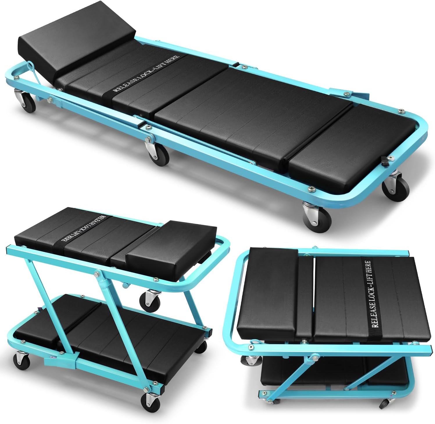 DNA MOTORING 48" 2 IN 1 Folding Rolling Garage Shop Creeper Roller Seat, 7 Pcs 2" Casters, 350 Lbs Weight Capacity, Tiffany Blue, TOOLS-00193-TB