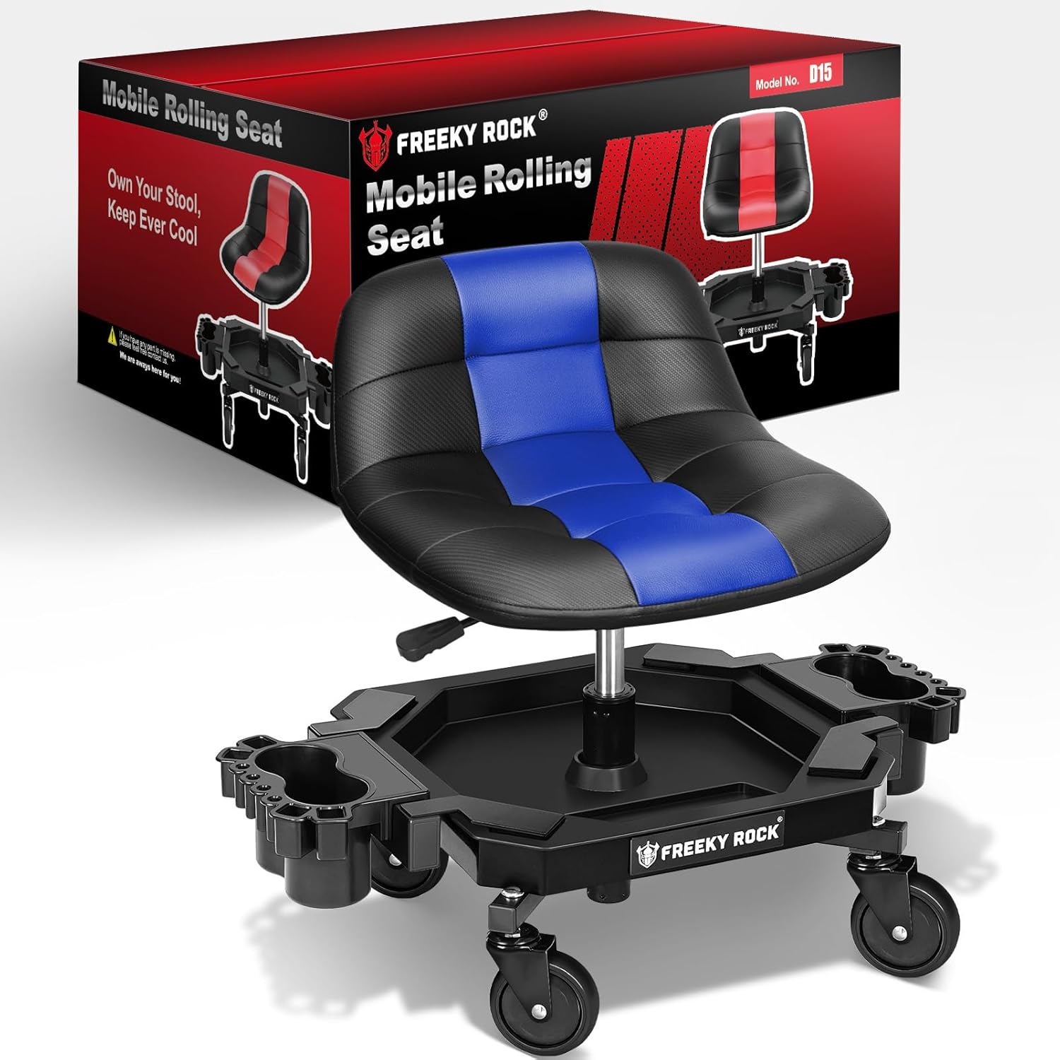 Rolling Stool with Wheels, Adjustable Height Pneumatic Garage Work Mechanic Stool Seat with Backrest, 400 LBS Capacity 360° Swivel Mechanic Crepper Chair with Tool Tray Storage, Blue