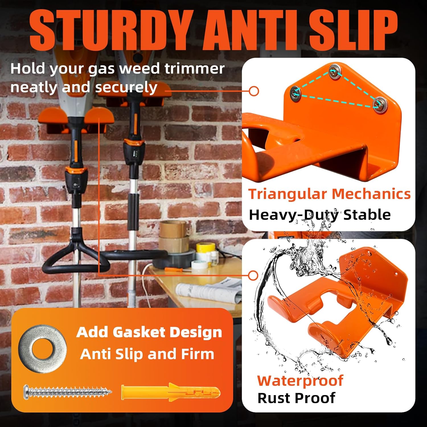 - Package Included: The trimmer rack hook kit come with 3 racks, 9 screws, 9 expansion tubes and 9 gaskets. Ensure trimmer wall hanger has more firm and stable. Garage rack suitable for storing tools in garages storage,chainsaw storage,gardens, tool rooms, and other places.