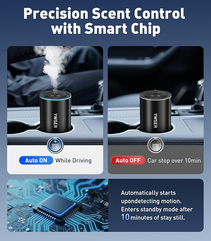 - 【Nano Mist Technology】YWSER smart car diffuser utilizes nano-level misting technology to transform aromatic essential oils into nanoparticles. Rapidly dispersing throughout every corner of your car, it deeply eradicates odor molecules for a fresher driving experience
