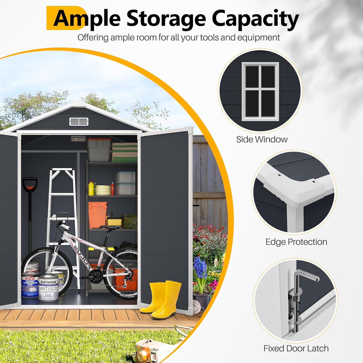 - Superior Weather Resistance:This 6×4 outdoor storage shed features 12 mm double-layer premium resin panels built for durability. It’s fully waterproof, fade-resistant, and UV-protected—designed to endure rain, snow, and harsh sun without cracking or peeling. Ideal as a plastic garden shed that stays solid and low maintenance for years