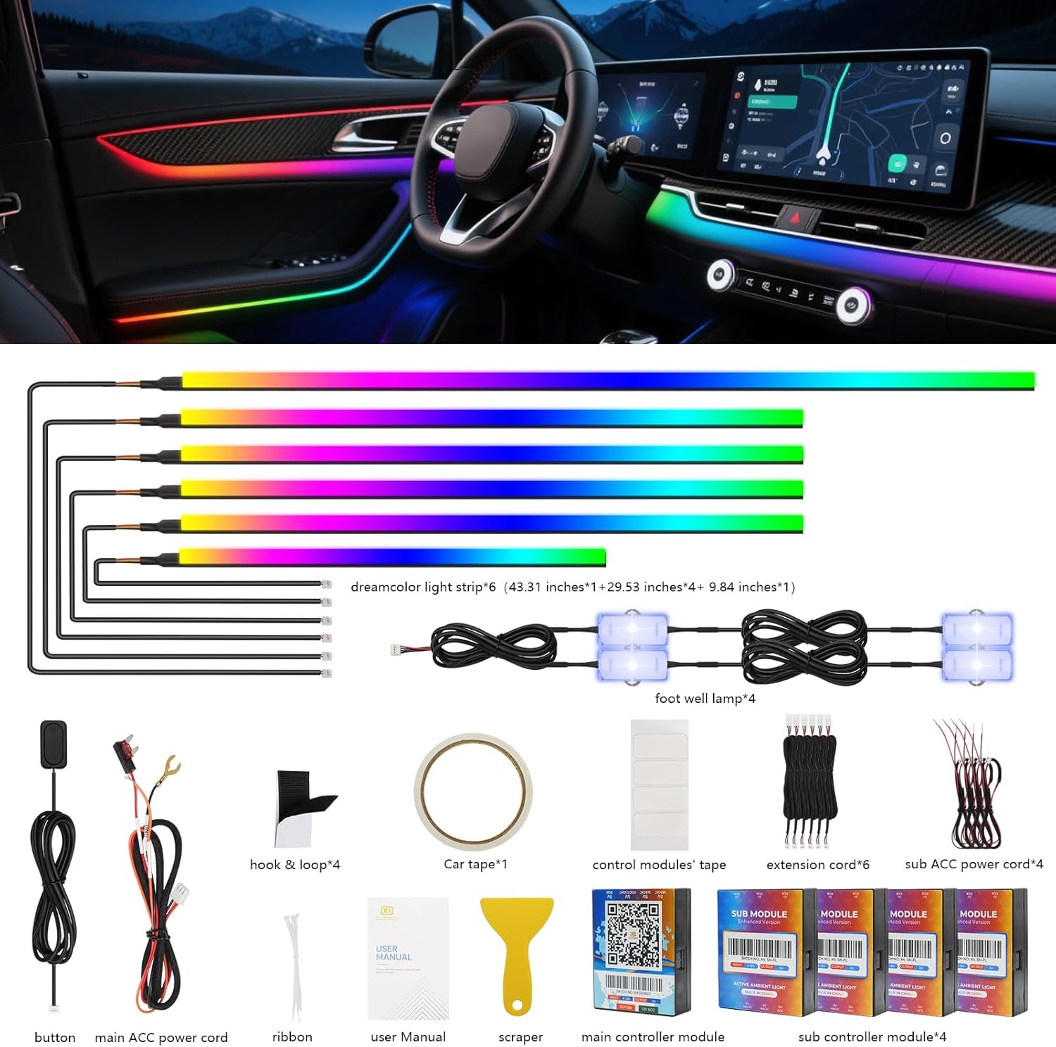 - 【 2-Year Warranty & Universal Compatibility】 Drive with confidence backed by our 2-Year worry-free warranty. Universally compatible with all 12V/24V cars and trucks (6V-18V operating range). Kit includes: 6x Dreamcolor Light Strips(43.31 inches*1+29.53 inches*4+ 9.84 inches*1), 4x foot well lamp,6x Extension Cords, 4x Sub ACC Power Cords, 1x Main ACC Power Cord, 1x Hidden Button, 1x Main Controller, 4x Sub Controllers, 1x Full Installation Package. Transform your vehicle with premium car led lights interior wireless ambient lighting today!