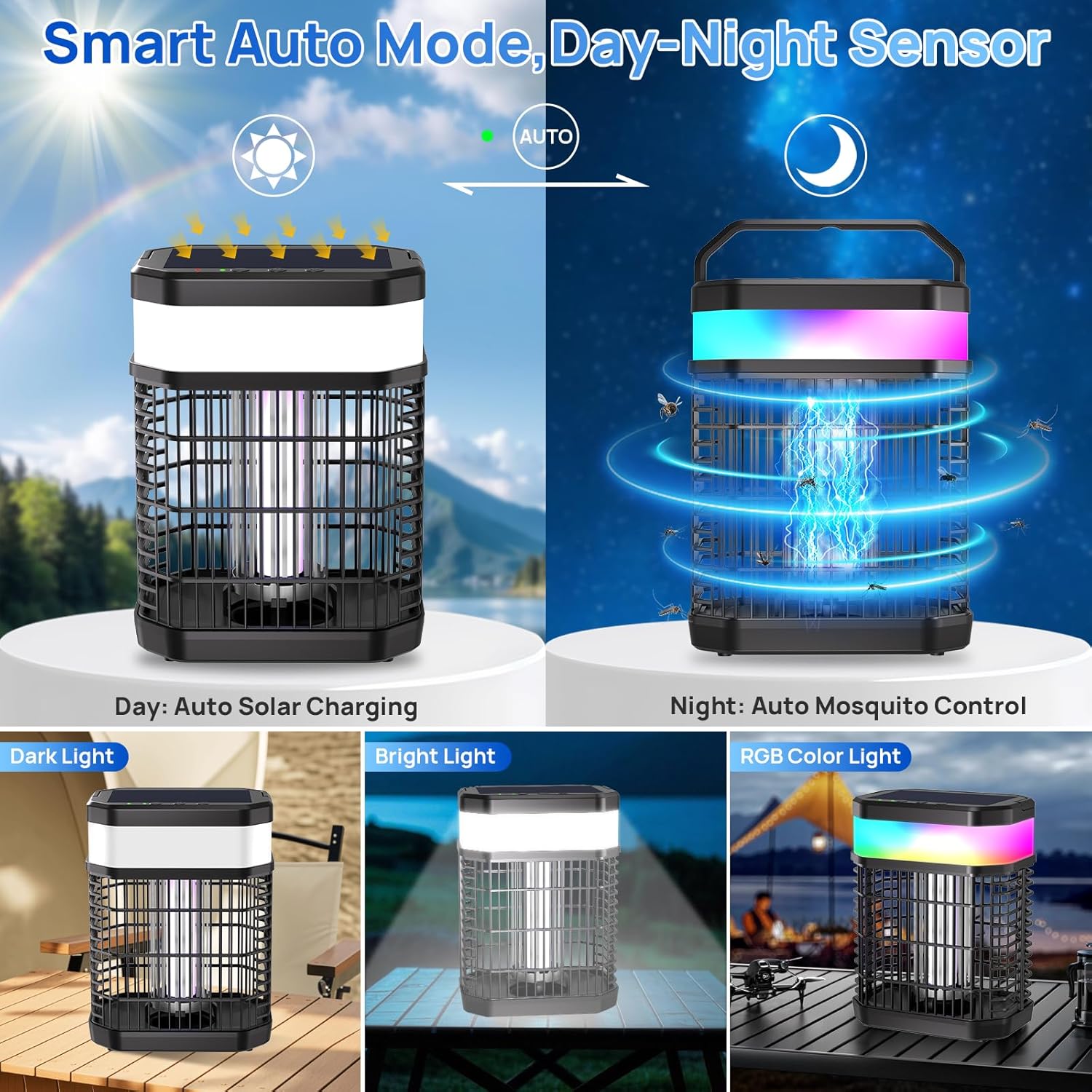 - 【Multy-Functions】The new mosquito repellent outdoor for patio built-in smart auto day/night sensor which turn on mosquito trap mode to kill insect at night and turn off at day for solar charging to save energy;also come with LED light for daily lighting needs.If you are going to camping it can completely replace your other camping-lamp and help you eliminate flying insects at the same time.
