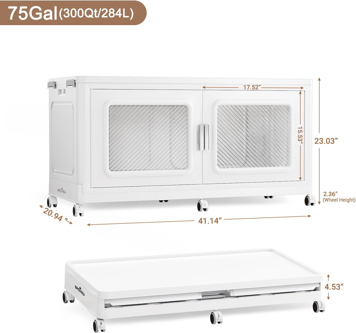 - 【Extra Large Storage Bin】75 Gal (300 QT) * 1 Pack. Dimensions: 41.14"(L) x 20.94"(W) x 22.03"(H) | Interior: 38.46"(L) x 18.82"(W) x 19.17"(H). The plastic storage bins featuring a 5.98 ft² bottom area and 1.92 ft height, ideal for maximizing large-space storage in bedrooms, garages, or closets. (Note: For indoor use only)