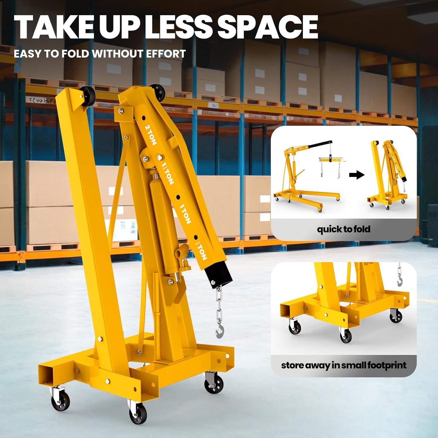 - 【Weight Adjustable & Folding Design】: 4 adjustable load arm: 1100 / 2200 / 3300 / 4400 lb (0.5T-2T) meets different reqirements. durable ram hydraulic cylinder. The extension arm and stand fold easily for convenient storage of which the rear 4 can be rotated 360 degrees for easy & fast relocation