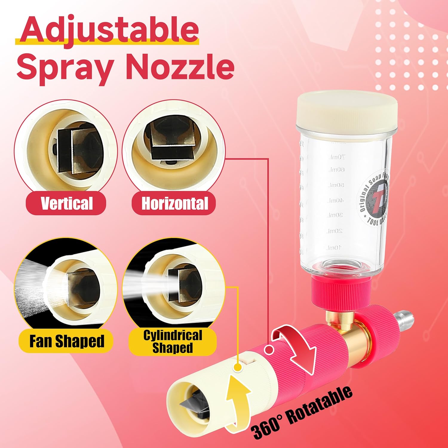 - ADJUSTABLE NOZZLE: The car wash soap sprayer features a fully adjustable nozzle, allowing you to customize the spray pattern and direction. The white adjustment lets you switch from a fan-shaped spray to a more focused cylindrical shape, while the pink adjustment lets you change the spray direction from vertical to horizontal, ensuring you to tackle all your cleaning needs with ease