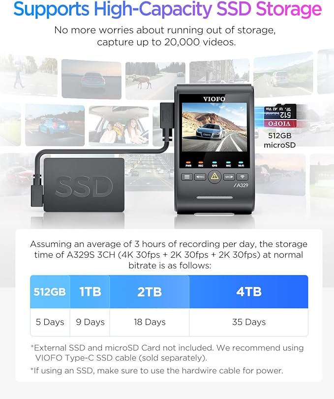 - [Support Up to 4TB SSD or 512GB microSD] Say goodbye to storage limitations! The A329S supports external SSDs up to 4TB or microSD cards up to 512GB, allowing for uninterrupted recording for over 3 weeks. Perfect for long road trips without constant overwriting worries. We recommend using the optional VIOFO Type-C SSD cable. (*Note: microSD card and SSD storage are not included. )