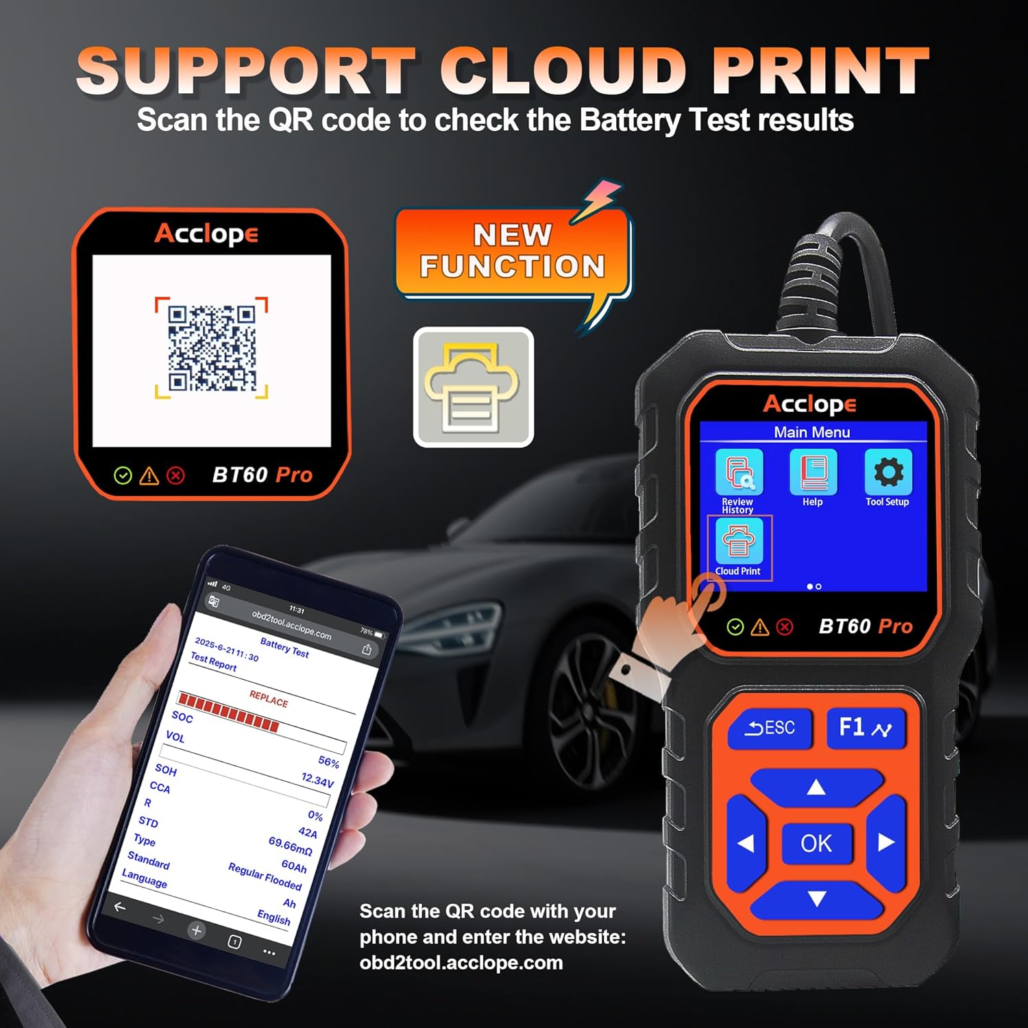 BT60 Pro Acclope Car Battery Tester with Cloud Printing 100-3000 CCA 6V 12V 24V AGM Lithium Gel Battery Checker Automotive Alternator Digital Analyzer Charging Cranking System Vehicles Truck Home-use
