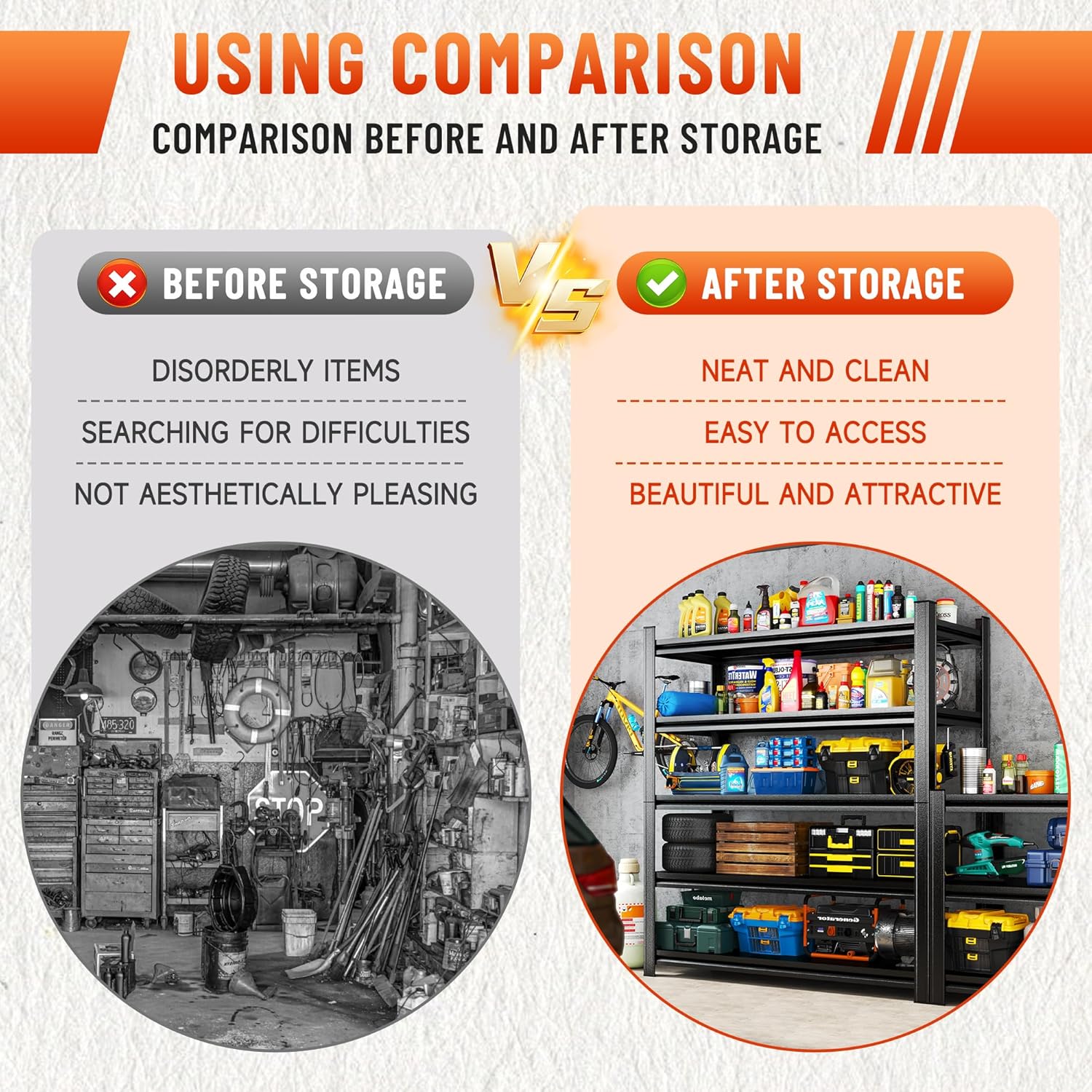 - ăFlexible Height Adjustment, Greatly Improve Space UtilizationăThis garage shelf can freely raise and lower the height of the five tiers of boards through the design of micro-adjustable slots, which can accurately match the different sizes of items from toolboxes and paint buckets to engines, containers and other items, and improves the utilization rate of each tier! The garage shelves are designed with tool-less adjustments, locking with the push of a finger, no need to remove bolts, and switching can be done in less than 30 seconds.