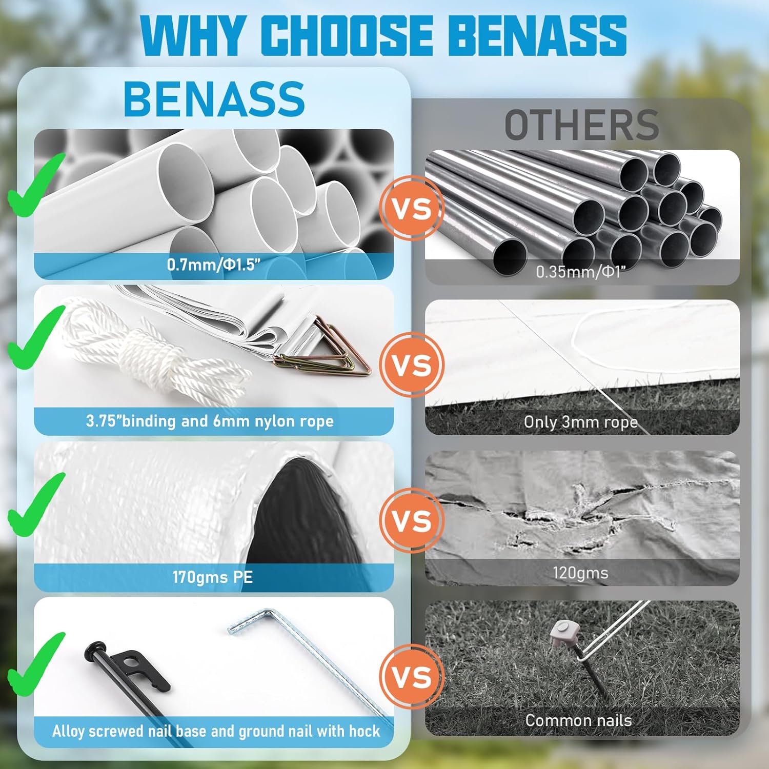 - Super Heavy Duty - Benass portable garage use 1.5" galvanized steel frame and 170gms PE canopy top, is more durable than others. Adding the accessories set, it will be firmer