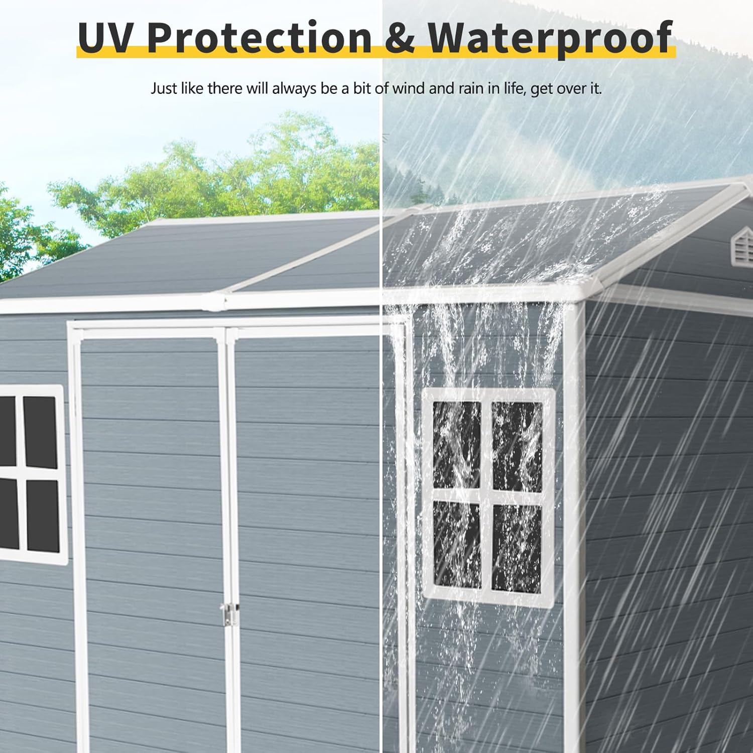 - đ ăAll-Weather Resin DurabilityăCrafted from high-quality plastic resin, this resin shed is built to handle rain, snow, and sunlight with ease. The waterproof and UV-resistant exterior helps protect your stored items all year long, while the reinforced double-wall panels add strength and thermal stability for lasting outdoor performance