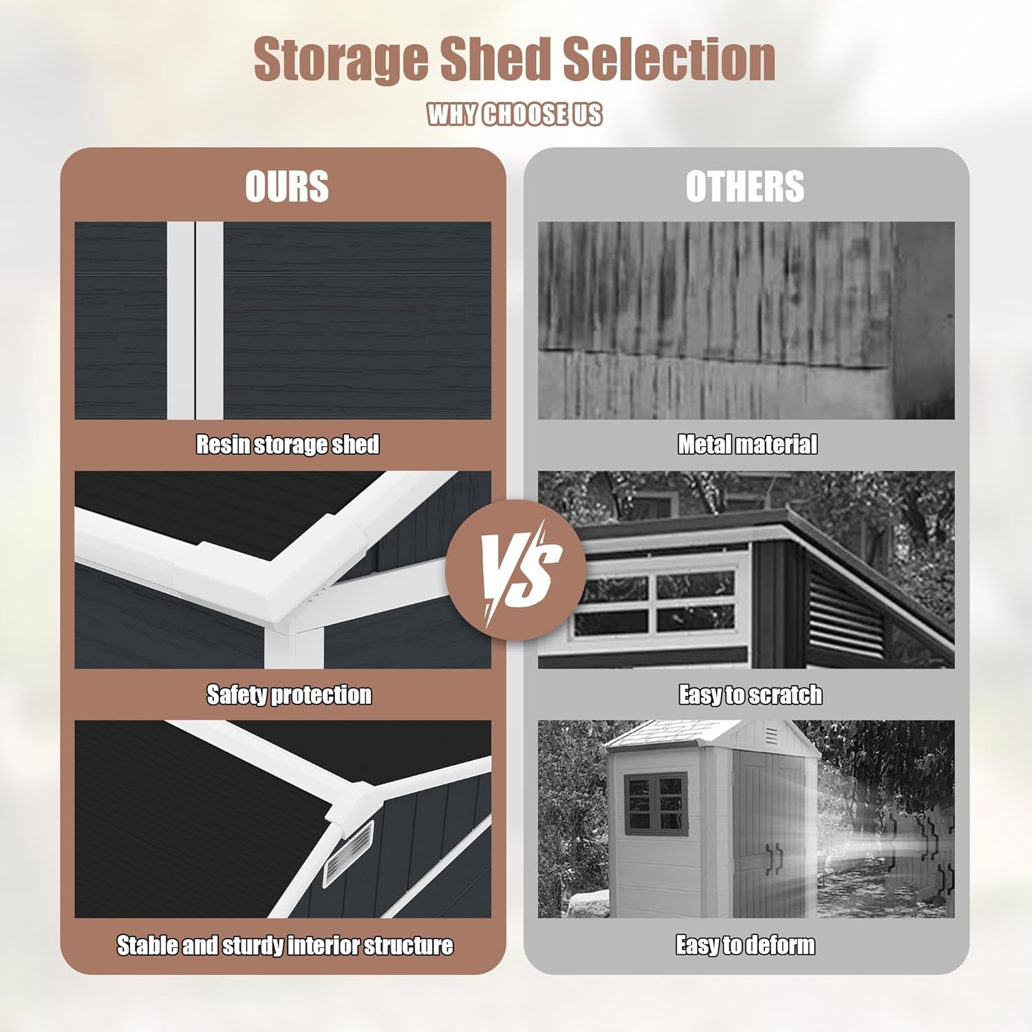 - đ ăAll-Weather Resin DurabilityăCrafted from high-quality plastic resin, this resin shed is built to handle rain, snow, and sunlight with ease. The waterproof and UV-resistant exterior helps protect your stored items all year long, while the reinforced double-wall panels add strength and thermal stability for lasting outdoor performance