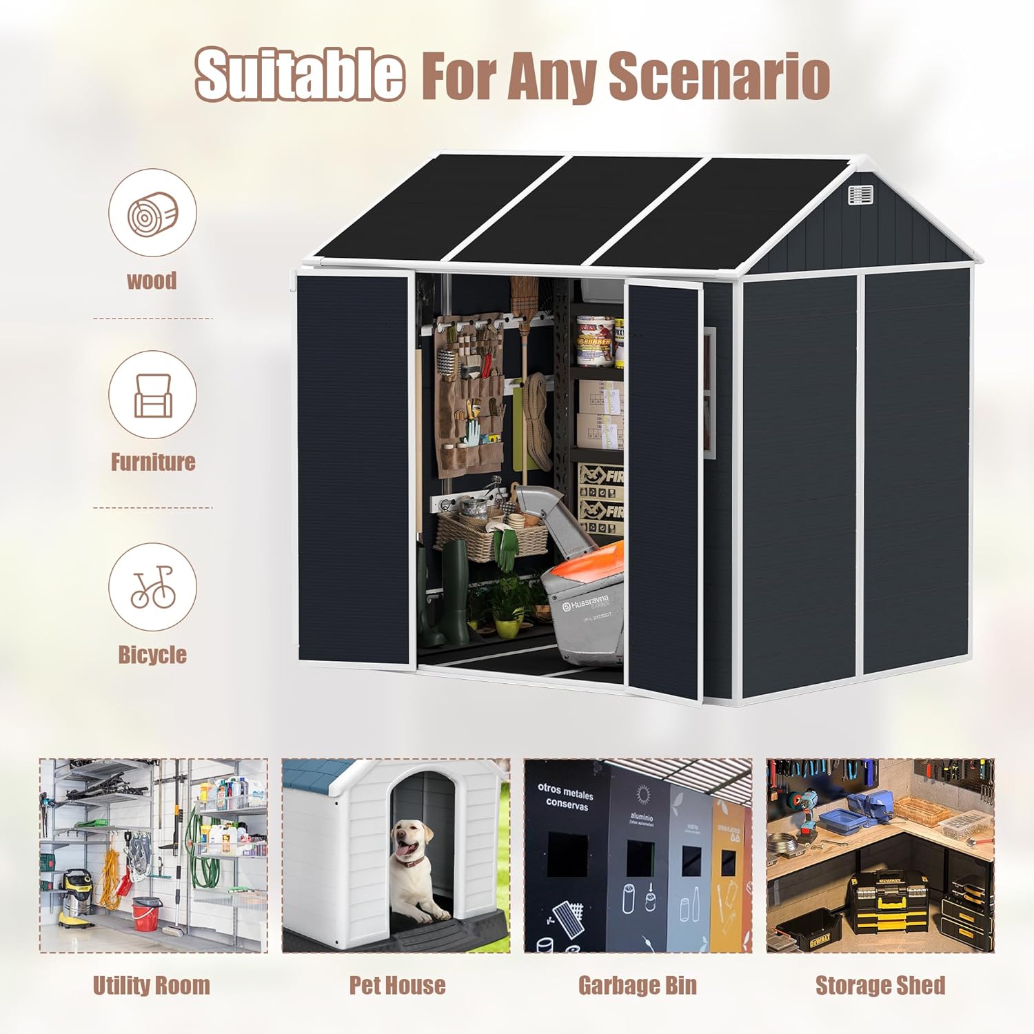- đ ăSpacious & Versatile Outdoor StorageăThis generously sized outdoor storage shed offers ample space to store lawn mowers, bicycles, gardening tools, and storage racksâhelping to keep your backyard, patio, or lawn organized and clutter-free. Its flexible design also allows it to double as a ventilated pet house or a sunlit greenhouse, making the most of your outdoor area