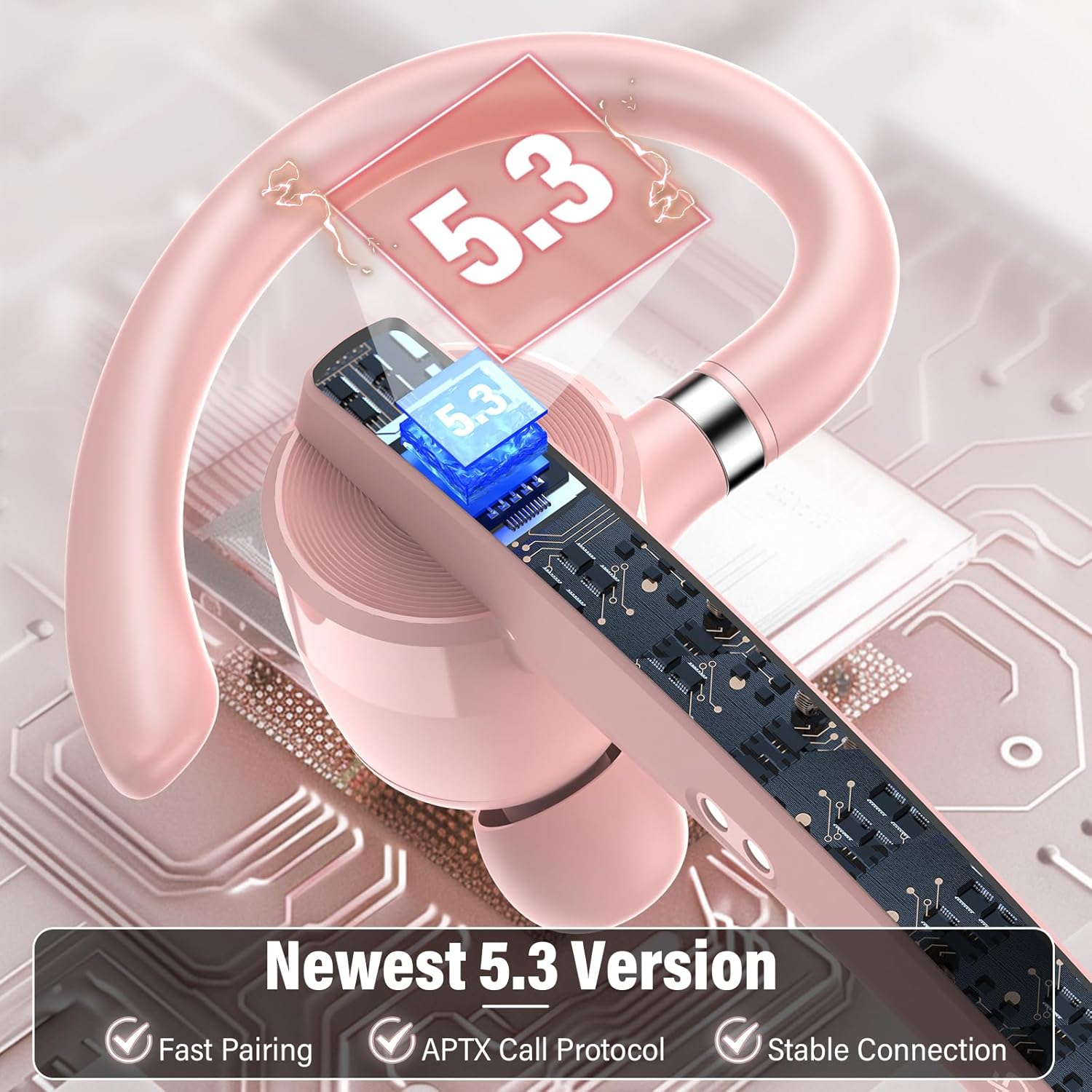 Bluetooth Headset, Wireless Bluetooth 5.3 Earpiece, 90Hrs Hands Free Headset with APTX HD Audio & Mute Button, Dual Noise Cancelling Mics, Single-Ear Headphone for Trucker/Business/Gym/Pink