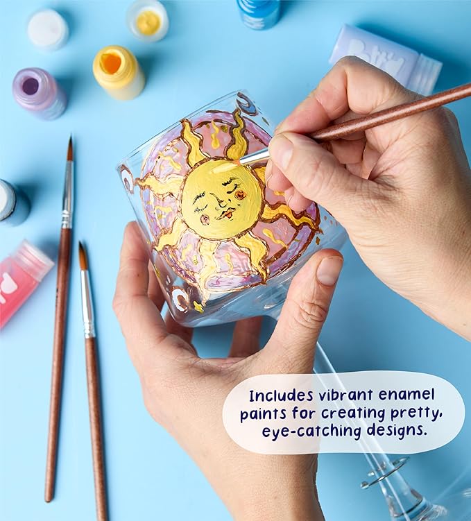 - Decorate your glasses using our 15 custom enamel paints, 8 high quality brushes and 4 easy to use paint pens. Whether you’re going bold with colour or keeping things minimal, this kit makes it easy to bring your ideas to life on glass.