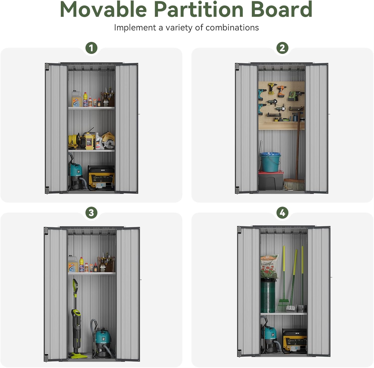 - Customizable & Sturdy Shelving System: Experience ultimate flexibility with this outdoor cabinet’s adaptable shelving. It includes 2 removable shelves, each supporting up to 75 LBS, ideal for organizing heavy items like power tools, paint cans, and gardening gear. Easily tailor the layout in this vertical storage shed to meet your specific storage needs.