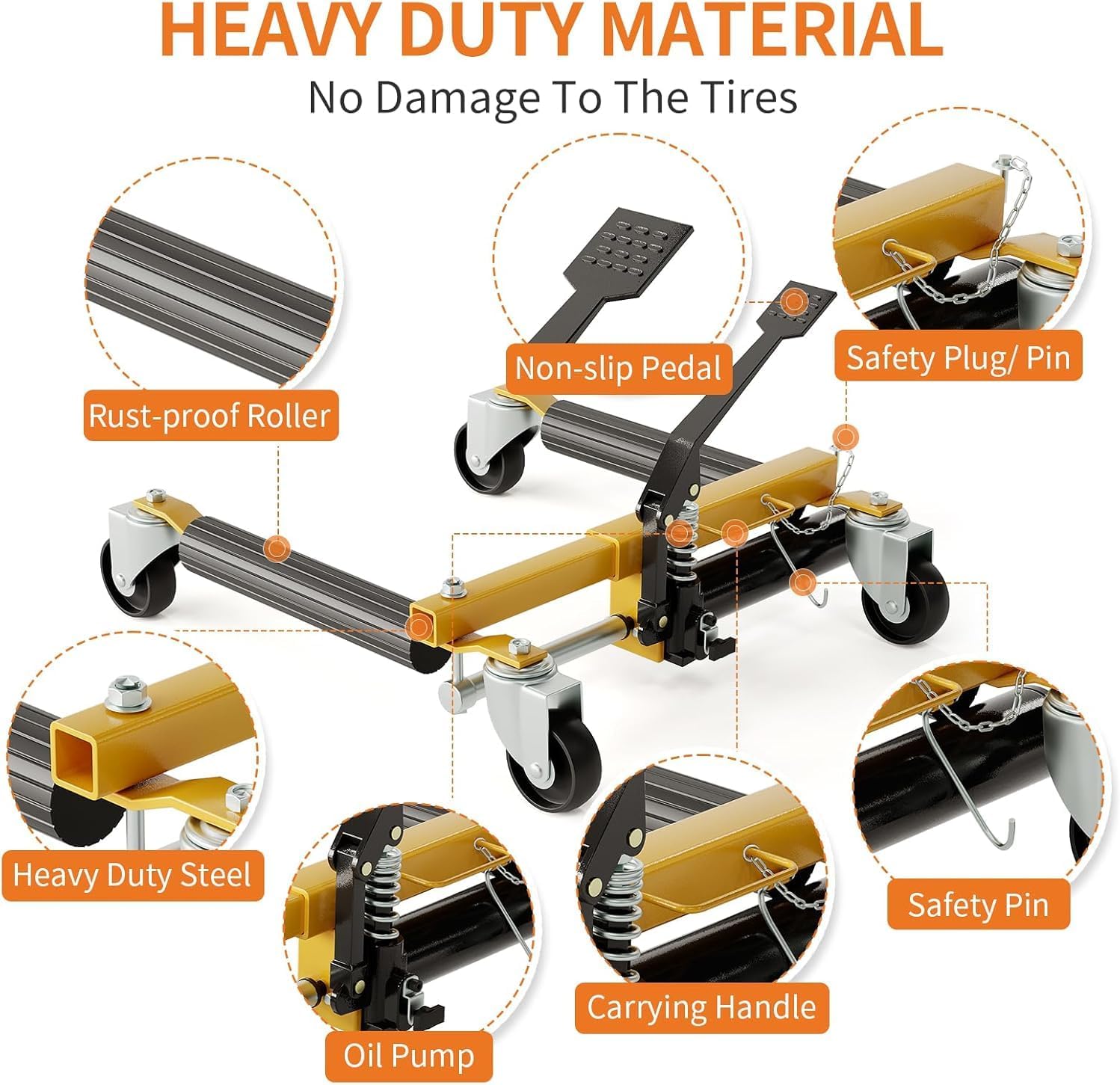 - Hydraulic Lift System for Effortless Operation:Featuring an advanced hydraulic oil pump mechanism, this dolly lifts vehicles 40% faster than traditional pedal ratchet systems. Enjoy reduced manual effort and minimized fatigue, making tire changes and maintenance a breeze.