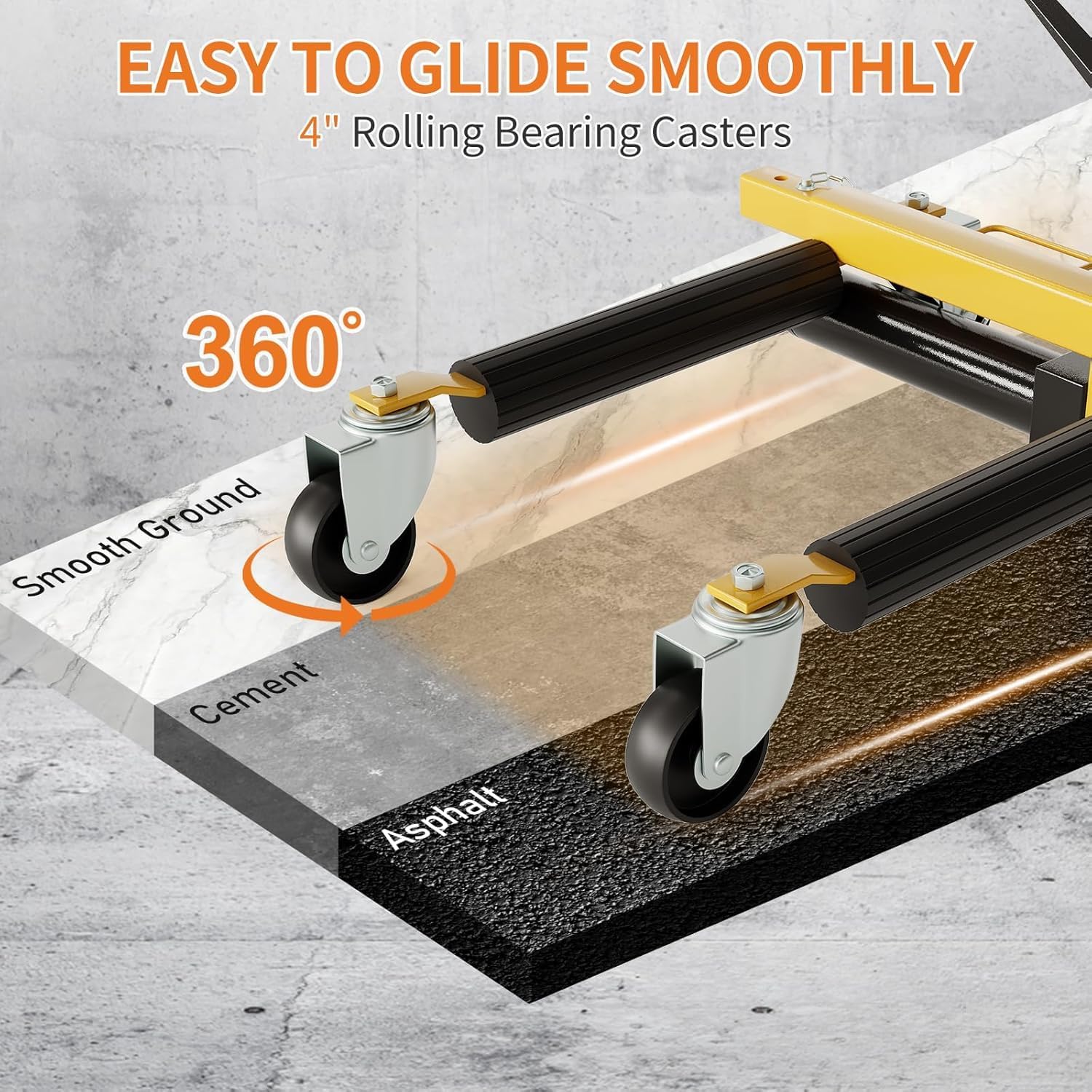 - 360° Smooth Mobility & Floor Protection:Equipped with 4-inch heavy-duty ball-bearing casters, our car dolly ensures seamless 360°rotation for effortless multidirectional movement. Easily spin vehicles in tight circles while safeguarding your floors from scratches and damage.