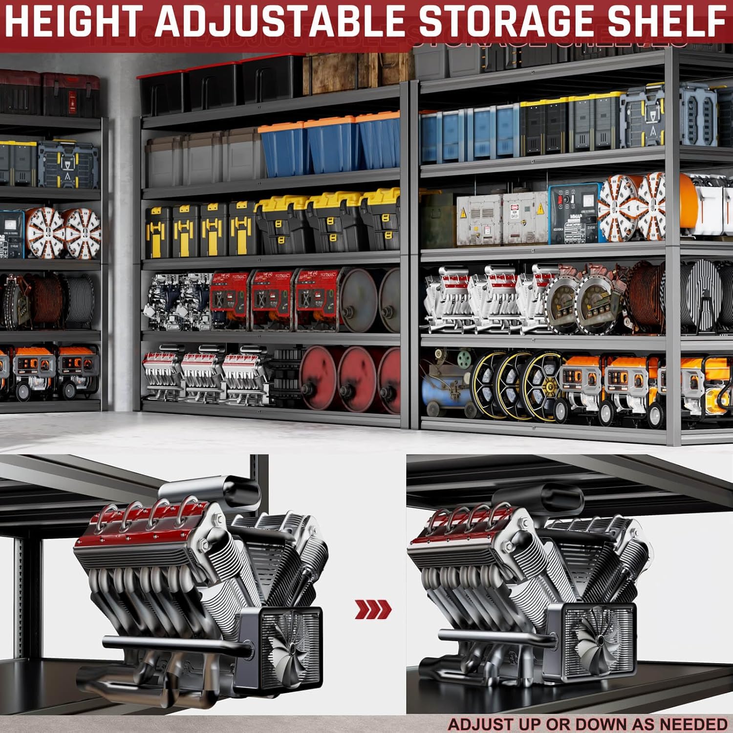 - ăAdjustable Heavy Duty Metal Shelves to Meet Different NeedsăThe height of each tier can be adjusted not only by moving the crossbar to meet the needs of different heights, but also the shelves can be assembled or disassembled into a variety of different metal shelves. The 84-inch tall 3800 lb. load-bearing garage shelves are not only strong, but they also give you more storage space.