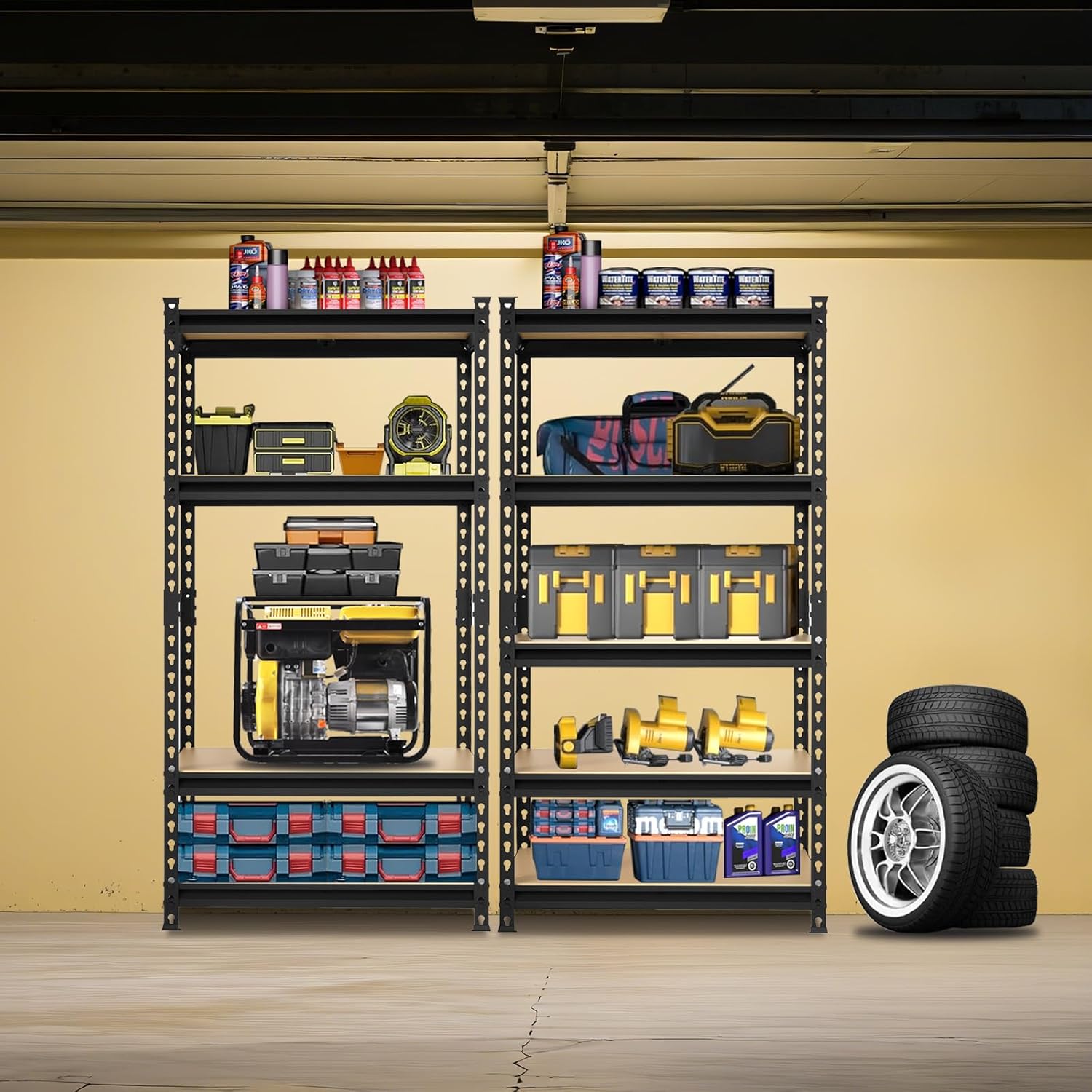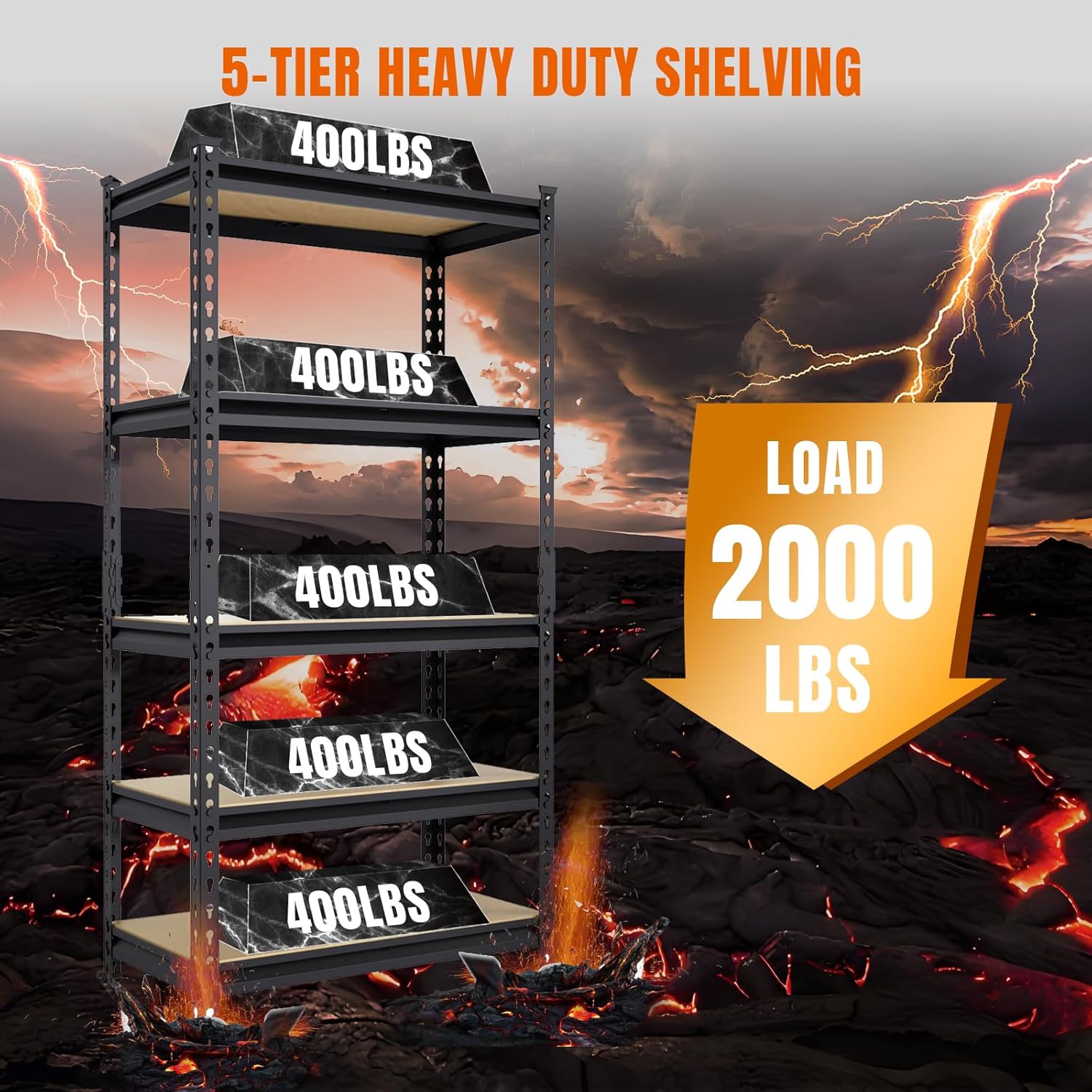 - Garage Shelving Heavy Duty Load 2000LBS: BIG RED storage shelves adopts rolled edge thickened columns, each metal shelving with support ribs. Made of high-quality metal frame+wood boards,so each shelf can hold up to 400 lbs, with a total bearing capacity of 2000 lbs, which makes 5-tier closet shelves more stable, solid and more stuff can be stored.