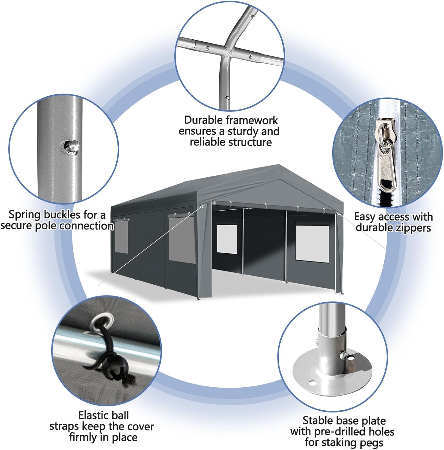 - Ventilated Windows & Removable Sidewalls: Featuring dual removable sidewalls equipped with roll-up ventilation windows, you can customize airflow through adjustable side walls and windows while providing superior protection from weather elements. The convenient double-zipper door system ensures both optimal ventilation and effortless access to the interior space