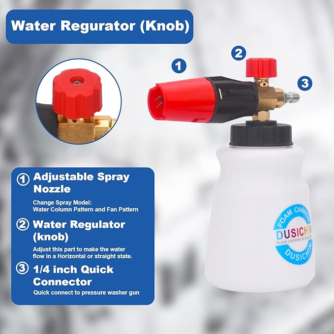 - 【Wide Neck Foam Cannon】: Container Capacity: 1 Liter / 0.26 Gallon. Specification: 1000-4000 PSI. High Pressure Washer Gun core and Foam Lance core are made of heavy duty brass, designed to last and leak-free. High-density filter to prevent the foam bottle from clogging. Clear scale lines facilitates observation of capacity.