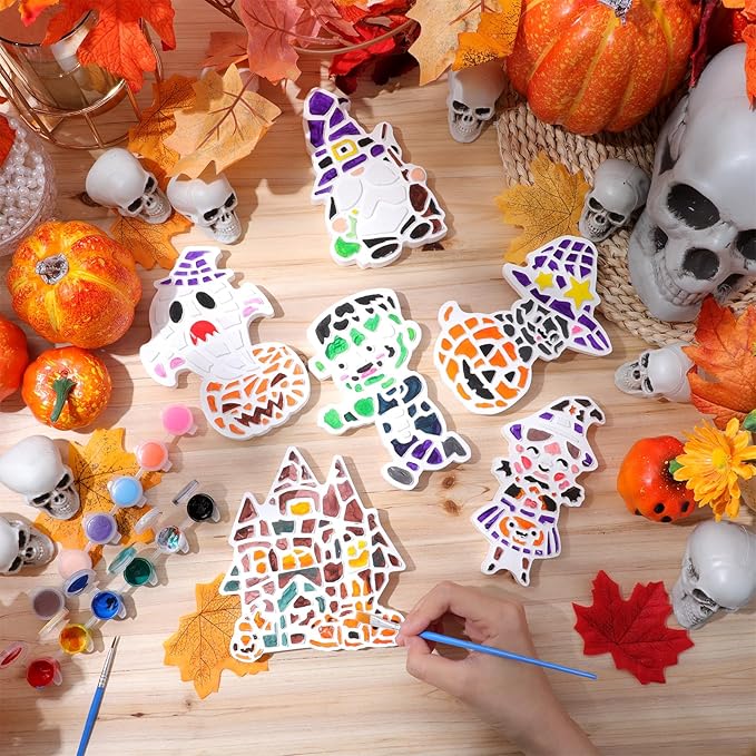- Halloween Ceramic Craft Kit: includes 6 ceramic stepping stone figurines in fun Halloween designs ( witch, pumpkin, ghost, zombies, gnome, haunted house), plus 12 colors paint pots and 6 brushes, everything painting crafts need for a DIY painting activity