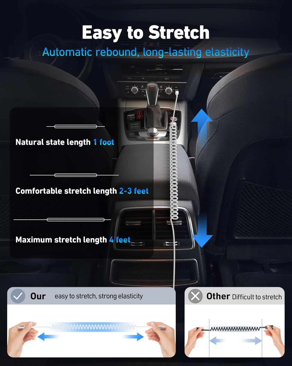 - Stretchable Length and High Flexibility: The natural length is 1 foot, the maximum stretch length is 4 feet, and the comfortable use length is stretched to 2-3 feet, automatically rebounding to the natural state when not in use. The braided cable is made of high-quality nylon, which has better flexibility, wear resistance, easy stretching, fast rebound, and long-lasting elasticity.