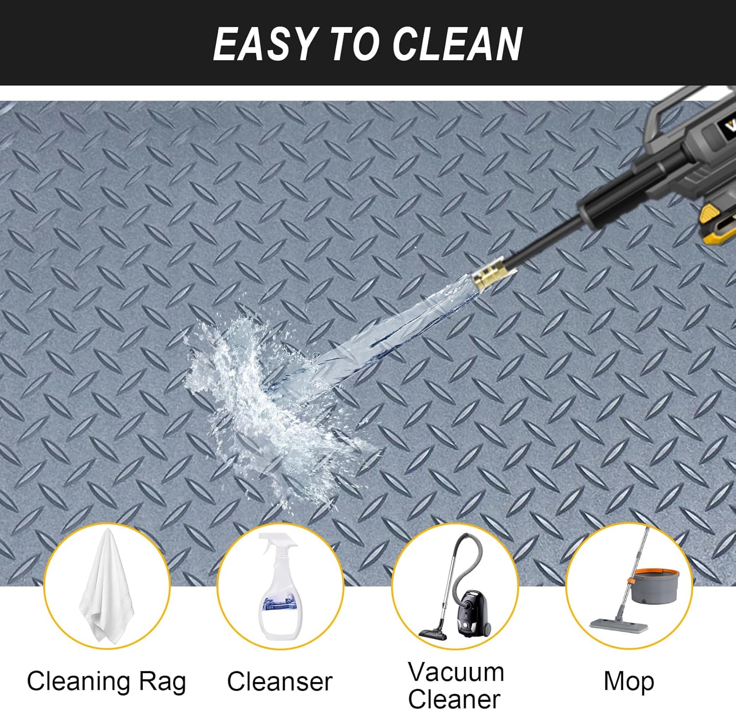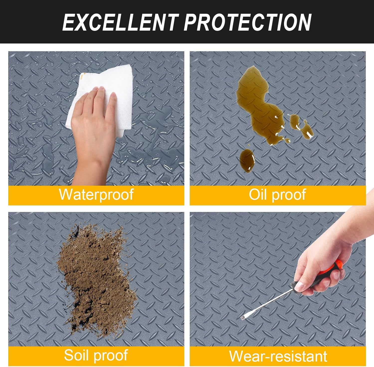 - Anti-Slip Design: The under car mat engineered with a diamond plate texture for superior slip resistance, ensuring safety for both foot traffic and parked vehicles even in damp conditions.In order to make the mat does not slip, you can use double-sided tape on all sides(not included in the package)