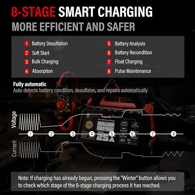 - HD LCD Screen & Engine Start Aid: Features true 8-stage intelligent charging: Desulfation, Soft Start, Bulk Charge, Absorption, Analyze, Repair, Float, and Pulse Maintenance, which help extend battery life and repair issues. The clear LCD screen displays charging stages and parameters, so you always know the status. The engine start function delivers 100A to help activate your battery and start your car within 100 seconds