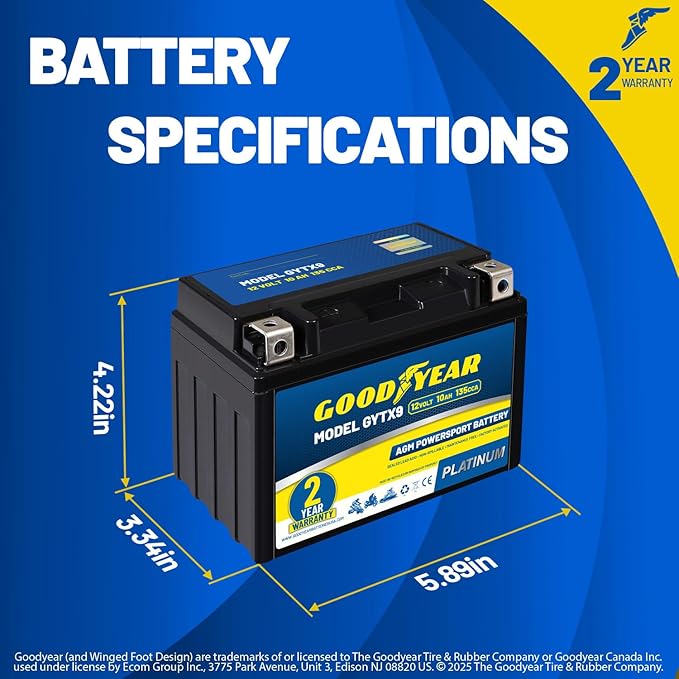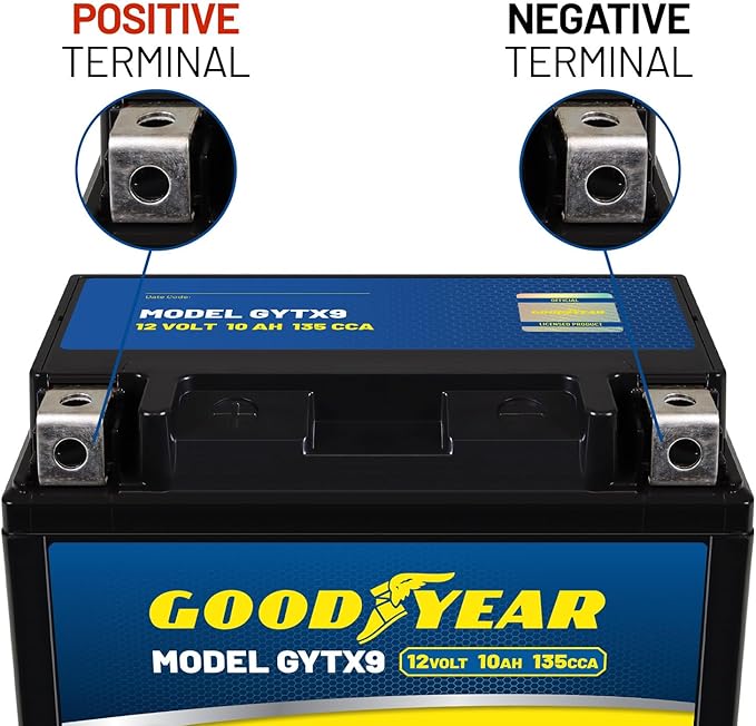 Goodyear GYTX9-12 Volt 10 AH, 135 CCA, Rechargeable High-Performance, Maintenance Free, SLA - AGM Battery for Motorcycle, ATV, UTV, 4-Wheeler, Snowmobile, Watercraft and more!