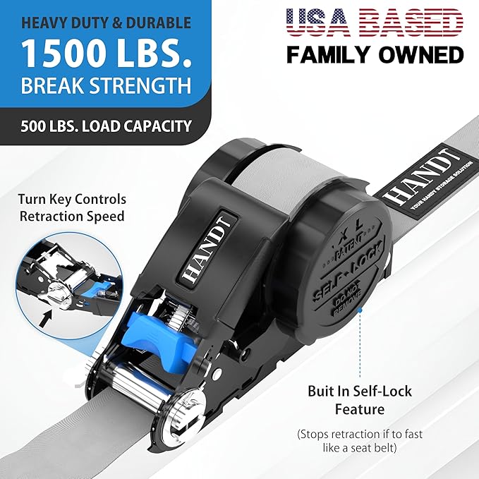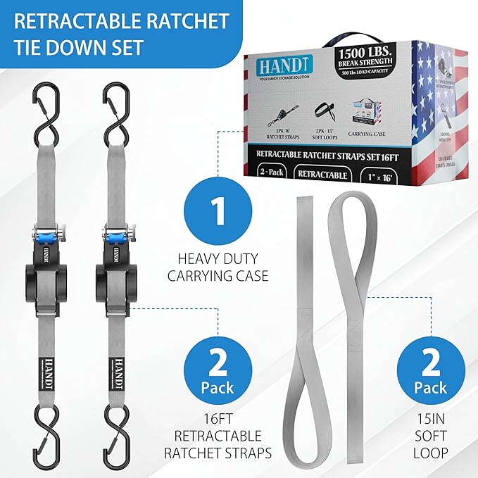 - USA Based & Family Owned - As Father and Son tradesmen, the handy retractable ratchet straps heavy duty design has been the ultimate auto ratchet straps self retractable solution. Included soft loops pair perfectly with the self retracting ratchet straps for trucks trailers & more
