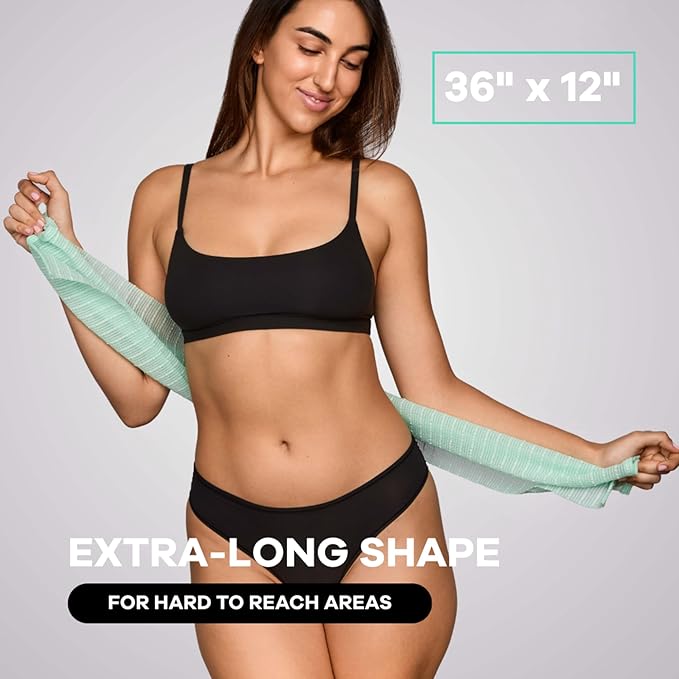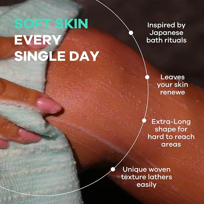 - DUAL-PURPOSE SHOWER BODY SCRUBBER & BACK SCRUBBER: The extended length of this Japanese exfoliating washcloth makes it perfect as a back loofah for reaching tough spots, while also working as versatile body wash cloths. Use this exfoliating towel for shower folded for targeted cleansing or stretched across the back for a complete exfoliating experience.