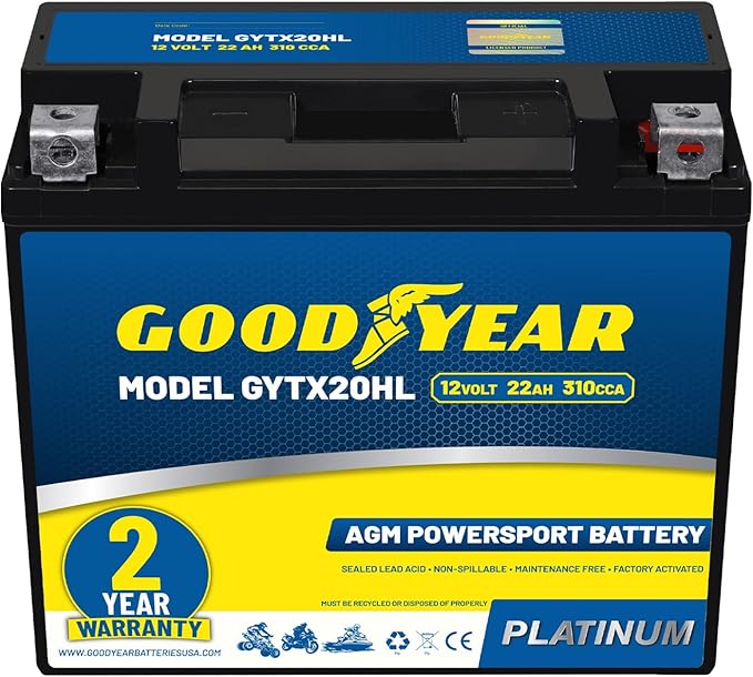 Goodyear GYTX20HL - 12 Volt 22 AH, 310 CCA, Rechargeable High-Performance, Maintenance Free, SLA - AGM Battery for Motorcycle, ATV, UTV, Scooter, Snowmobile, Motorbike and more!