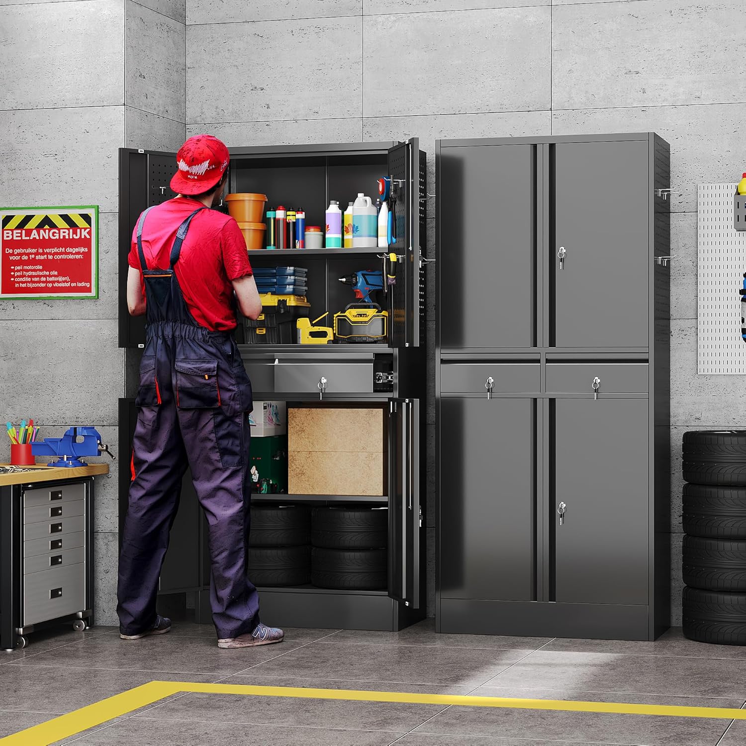 71" Metal Garage Storage Cabinet with 8 Hooks and Pegboards,2 Drawer Tool Storage with Locking Doors and Adjustable Shelves,Heavy Duty Steel Tool Cabinet for Garage, Warehouse
