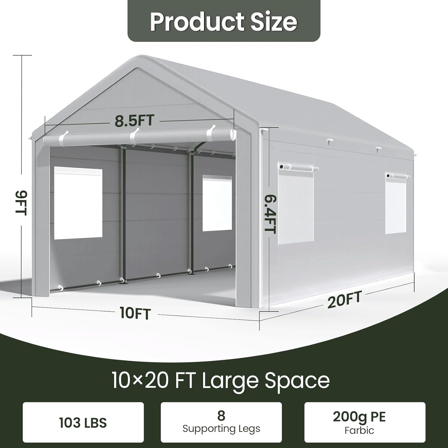 - PREMIUM CAR PORT COVER: 200G PE headliner covers offer excellent water, UV, tear and fade resistance. Removable 200G PE sidewalls provide long-lasting, comprehensive protection for your belongings all year round. 10x20 car canopy tent can be used without sidewalls when they are not needed