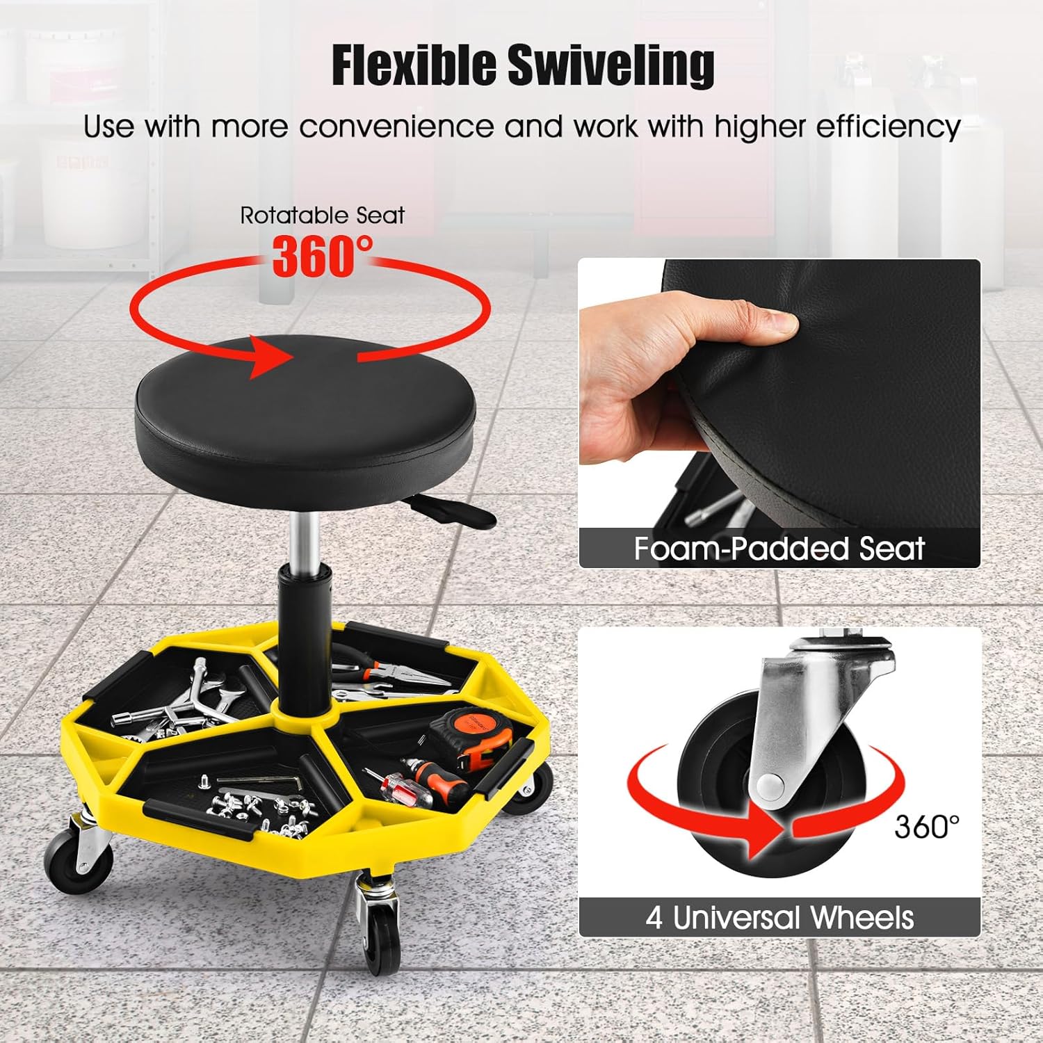 - Adjustable Height & Swiveling Creeper: With an automatic lift level, our rolling mechanic stool can easily adjust the seat height from 16" to 22", allowing different users to find their ideal seat position without having to bend or kneel while working. In addition, the seat rotates 360°, which is especially useful for tasks that require reaching different areas without moving the entire stool.