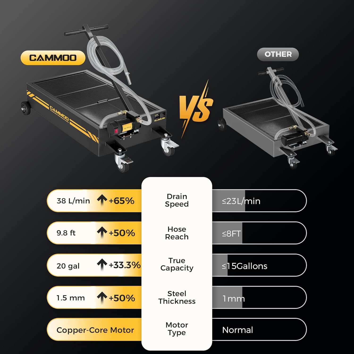 - High Capacity:Oversized 35.4" x 19.7" x 6.7" steel tank delivers a verified 20 gallons and provides a bigger footprint than standard oil drain pans so shop owners, fleet managers, farmers and DIYers can drain a full-size pickup, two RVs or four sedans in one go with less lifting, fewer trips to the recycler and more time for paid jobs. It works with all common waste oils (motor, hydraulic, etc.)—gasoline explicitly excluded.